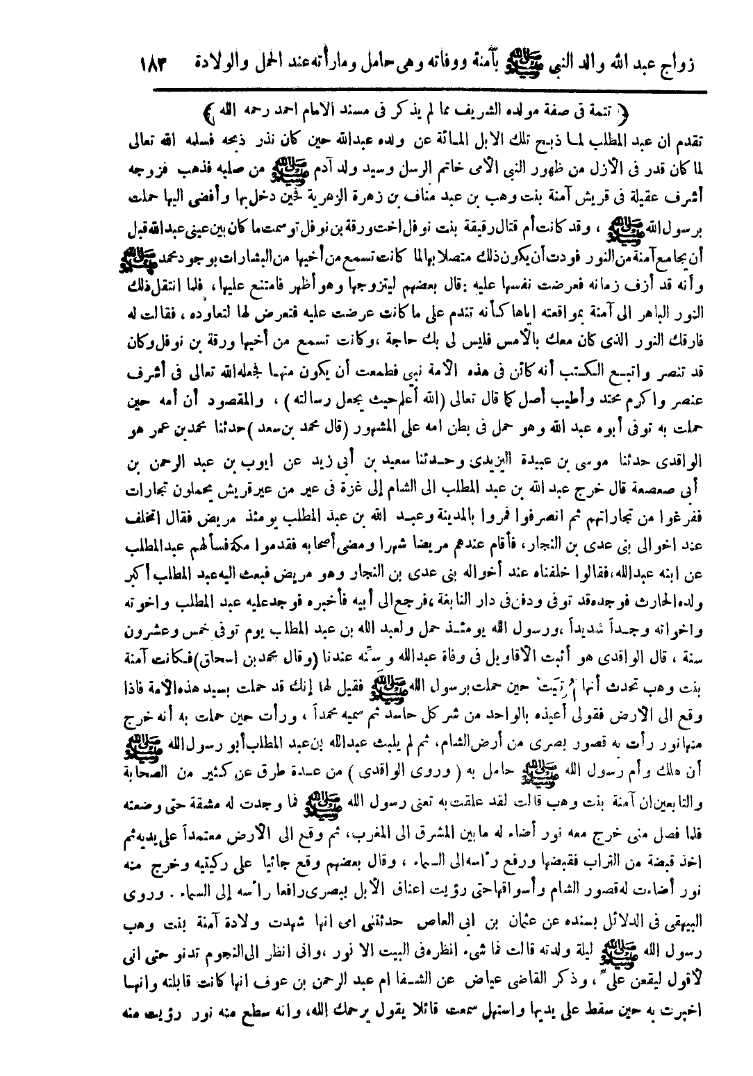 تقدم أن عبد المطلب لما ذبح تلك الأبل المائة ولده عبد الله حين كان نذر ذبحه فسلمه الله تعالى لما كان قدر في الأزل من ظهور النبي الأمي خاتم الرسل وسيد ولد آدم صلى الله عليه وسلم من صلبه فذهب فزوجه أشرف عقيلة في قريش آمنة بنت وهب بن عبد مناف بن زهرة الزهرية فحين دخل بها أفضى إليها حملت برسول الله صلى الله عليه وسلم، وقد كانت أم قتال رقيقة بنت نوفل أخت ورقة بن نوفل أو سمت ما كان بين عيني عبد الله قبل أن يجامع آمنة من النور فودت أن يكون ذلك متصلًا بها لما كانت تسمع من أخيها من البشارات بوجود محمد صلى الله عليه وسلم وأنه قد أزف زمانه فعرضت نفسها عليه: قال بعضهم ليتزوجها وهو أظهر فامتنع عليها، فلما انتقل ذلك النور الباهر إلى آمنة بمواقعته إياها كأنه تندم على ما كانت عرضت عليه فتعرض لها لتعاوده، فقالت له فارقك النور الذي كان معك بالأمس فليس لي بك حاجة، وكانت تسمع من أخيها ورقة بن نوفل وكان قد تنصر واتبع الكتب أنه كائن في هذه الأمة نبي فطمعت أن يكون منها فجعله الله تعالى في أشرف عنصر وأكرم محتد وأطيب أصل كما قال تعالى (الله أعلم حيث يجعل رسالته)، والمقصود أن أمه حين حملت به توفى أبوه عبد الله وهو حمل في بطن أمه على المشهور (قال محمد بن سعد) حدثنا محمد بن عمر هو الواقدى حدثنا موسى بن عبيدة اليزيدي وحدثنا سعيد بن أبي زيد عن أيوب بن عبد الرحمن بن أبي صعصعة قال خرج عبد الله بن عبد المطلب إلى الشام إلى غزة في عير من غير قريش يحملون تجارات ففرغوا من تجاراتهم ثم انصرفوا فمروا بالمدينة وعبد الله بن عبد المطلب يومئذ مريض فقال أتخلف عند إخوالى بن عدي بن النجار، فأقام عندهم مريضًا شهرًا ومضى أصحابه فقدموا مكة فسألهم عبد المطلب عن أبنه عبد الله، فقالوا خلفناه عند أخواله بني عدي بن النجار وهو مريض فبعث إليه عبد المطلب أكبر ولده الحارث فوجده قد توفى ودفن في دار النابغة، فرجع إلى أبيه فأخبره فوجد عليه عبد المطلب وأخوته واخواته وجدًا شديدًا، ورسول الله يومئذ حمل ولعبد الله بن عبد المطلب يوم توفى خمس وعشرون سنة، قال الواقدى هو أثبت الأقاويل في وفاة عبد الله وسنة عندنا (وقال محمد بن إسحاق) فكانت آمنة بنت وهب تحدث أنها أتيت حين حملت برسول الله صلى الله عليه وسلم فقيل لها إنك قد حملت بسيد هذه الأمة فإذا وقع إلى الأرض فقولي أعيذه بالواحد من شر كل حاسد ثم سميه محمدًا، ورأت حين حملت به أنه خرج منها نور رأت به قصور بصرى من أرض الشام، ثم لم يلبث عبد الله بن عبد المطلب أبو رسول الله صلى الله عليه وسلم أن هلك وأم رسول الله صلى الله عليه وسلم حامل (وروى الواقدي) من عدة طرق عن كثير من الصحابة والتابعين أن آمنة بنت وهب قالت لقد علقت به تعني رسول الله صلى الله عليه وسلم فما وجدت له مشقة حتى وضعته فلما فصل مني خرج معه نور أضاء له ما بين المشرق إلى المغرب، ثم وقع إلى الأرض معتمدًا على يديه ثم أخذ قبضة من التراب فقبضها ورفع رأسه إلى السماء، وقال بعضهم وقع جاثيًا على ركبتيه وخرج منه نور أضاءت له قصور الشام وأسواقها حتى رؤيت أعناق الأبل ببصرى رافعًا رأسه إلى السماء. وروى البيهقى في الدلائل بسنده عن عثمان بن أبي العاص حدثتني أمي أنها شهدت ولادة آمنة بنت وهب رسول الله صلى الله عليه وسلم ليلة ولدته قالت فما شيء أنظره في البيت إلا نور، وأني انظر إلى النجوم تدنو حتى أني لأقول ليقعن علي، وذكر القاضي عياض عن الشفا أم عبد الرحمن بن عوف أنها كانت قابلته وأنها أخبرت به حين سقط على يديها واستهل سمعت قائلًا يقول يرحمك الله، وأنه سطع منه نور رؤيت منه