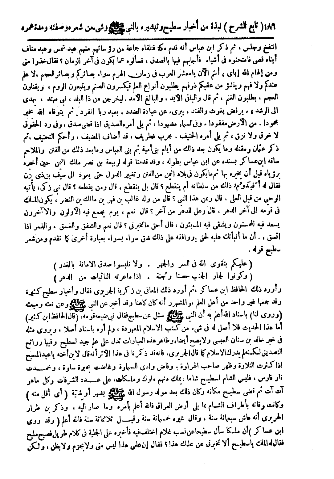 انتفخ وجلس، ثم ذكر ابن عباس أنه قدم مكة فتلقاه جماعة من رؤسائهم منهم عبد شمس وعبد مناف أبناه قصي فامتحنوه في أشياء فأجابهم فيها بالصدق، فسألوه عمان يكون في آخر الزمان؟ فقال خذوا مني ومن إلهام الله إياي، أنتم الآن يا معشر العرب في زمان الهرم سواء بصائركم وبصائر العجم، لا علم عندكم ولا فهم وينشؤ من عقبكم ذو فهم يطلبون أنواع العلم فيكسرون الصم ويتبعون الروم، ويقتلون العجم، يطلبون الغنم، ثم قال والباقي الأبد، والبالغ الأمد. ليخرجن من ذا البلد، نبي مهتد، يهدي إلى الرشد، يرفض يغوث والفند، يبرئ عن عبادة الضدد، يعبد ربا انفرد، ثم يتوفاه الله بخير محمودًا. من الأرض مفقودًا وفي السماء مشهودًا، ثم بلى أمره الصديق إذا قضى صدق، وفي رد الحقوق لا خرق ولا نزق، ثم بلى أمره الحنيف، مجرب غطريف، قد أضاف المضيف، وأحكم التحنيف، ثم ذكر عثمان ومقتله وما يكون بعد ذلك من أيام بني أمية ثم بني العباس وما بعد ذلك من الفتن والملاحم ساقه ابن عساكر بسنده عن ابن عباس بطوله، وقد قدمنا قوله لربيعة بن نصر ملك اليمن حين أخبره برؤياه قبل أن يخبره بها ثم ما يكون في بلاد اليمن من الفتن وتغيير الدول حتى يعود إلى سيف بن ذي يزن فقال له أفيدوم ذلك من سلطانه أم ينقطع قال بل ينقطع، قال ومن يقطعه؟ قال نبي زكى، يأتيه الوحي من قبل العلى، قال وممن هذا النبي؟ قال من ولد غالب بن فهر بن مالك بن النضر، يكون الملكفي قومه إلى آخر الدهر، قال وهل للدهر من آخر؟ قال نعم، يوم يجمع فيه الأولون والآخرون يسعد فيه المحسنون ويشقى في المسيئون، قال أحق ما تخبرني؟ قال نعم والشفق والغسق، والقمر إذا اتسق، أن ما أنبأتك عليه لحق: ووافقه على ذلك شق سواء بسواء بعبارة أخرى كما تقدم ومن شعر سطيح قوله.