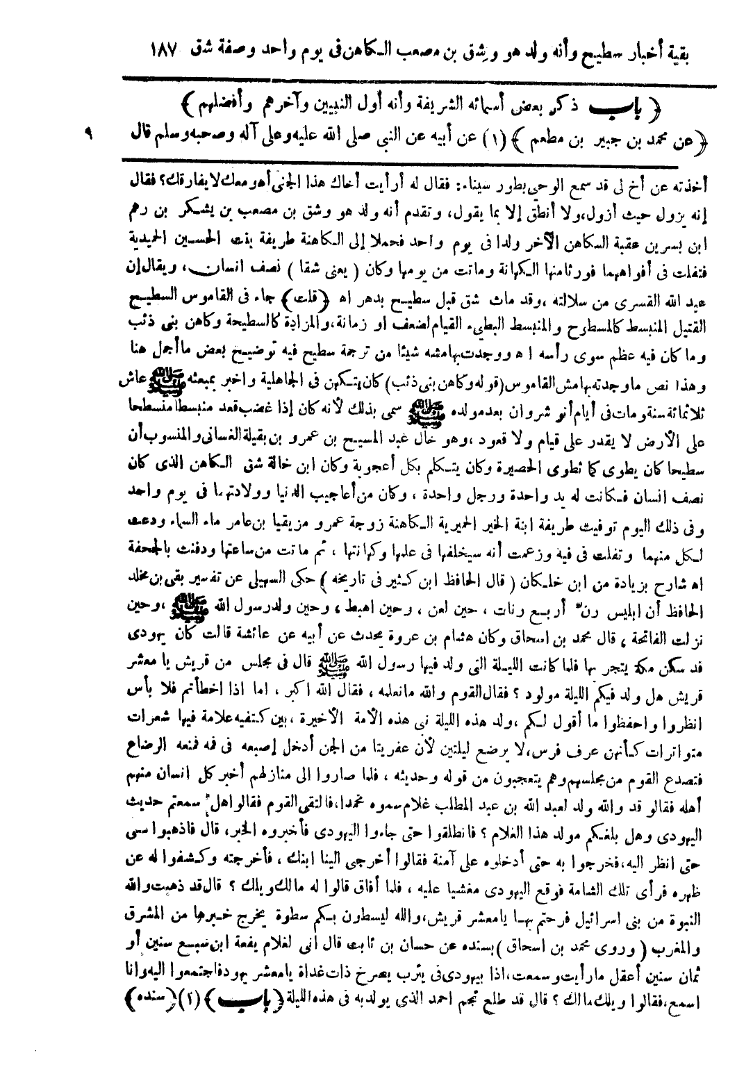 أخذته عن أخ لي قد سمع الوحي بطور سيناء: فقال له أرأيت أخاك هذا الجني أهو معك لا يفارقك؟ فقال إنه يزول حيث أزول، ولا أنطق إلا بما يقول، وتقدم أنه ولد هو وشق بن مصعب بن يشكر بن رهم ابن بسرين عقبة السكاهن الأخر ولدًا في يوم واحد فحملًا إلى الكاهنة طريفة بنت الحسين الحميدية فتفلت في أفواههما فو ثامنها الكهانة وماتت من يومها وكان (يعني شقا) نصف إنسان، ويقال إن عبد الله القسرى من سلالته، وقد ماث شق قبل سطيح بدهر أهـ (قلت) جاء في القاموس السطيح القتيل المنبسط كالسطوح والمنبسط البطيء القيام لضعف أو زمانة، والمزادة كالسيحة وكاهن بن ذنب وما كان فيه عظم سوى رأسه اهـ ووجدت بهامشه شيئًا من ترجمة سطيح فيه توضيح بعض ما أجمل هنا وهذا نص ما وجدته بها مش القاموس (قوله وكاهن بني ذئب) كان يتمكبن في الجاهلية وأخبر بمبعثه صلى الله عليه وسلم عاش ثلاثمائة سنة ومات في أيام أنو شروان بعد مولده صلى الله عليه وسلم سمى بذلك لأنه كان إذا غضب قعد منبسط منسطحًا على الأرض لا يقدر على قيام ولا قعود، وهو خال عبد المسيح بعن عمرو بن بقيلة الغساني والمنسوب أن سطيحًا كان يطوى كما ثطوى الحصيرة وكان يتكلم بكل أعجوبة وكان ابن خالة شق الكاهن الذي كان نصف إنسان فكانت له يد واحدة ورجل واحدة، وكان من أعاجيب الدنيا وولادتهما في يوم واحد وفي ذلك اليوم توفيت طريفة ابنة الخير الحميرية الكاهنة زوجة عمرو مزيقيًا بن عامر ماء السماء ودعت لكل منهما وتفلت في فيه وزعمت أنه سيخلفها في علمها وكهانتها، ثم ماتت من ساعتها ودفنت الجحفة اهـ شارح بزيادة من ابن خلكان (قال الحافظ ابن كثير في تاريخه) حكى السهيلى عن تفسير بقى بن مخلد الحافظ أن إبليس رن أربع رنات، حين لعن، وحين اهبط، وحين ولد رسول الله صلى الله عليه وسلم، وحين نزلت الفاتحة، قال محمد بن إسحاق وكان هشام بن عروة يحدث عن أبيه عن عائشة قالت كان يهودي قد سكن مكة يتجر بها فلما كانت الليلة التي ولد فيها رسول الله صلى الله عليه وسلم قال في مجلس من قريش يا معشر قريش هل ولد فيكم الليلة مولود؟ فقال القوم والله ما نعلمه، فقال الله أكبر، أما إذا أخطأتم فلا بأس انظروا واحفظوا ما أقول لكم، ولد هذه الليلة نبي هذه الأمة الأخيرة، بين كتفيه علامة فيها شعرات متواترات كأنهن عرف فرس، لا يرضع ليلتين لأن عفريتًا من الجن أدخل إصبعه في فمه فمنعه الرضاع فتصدع القوم من مجلسهم وهم يتعجبون من قوله وحديثه، فلما صاروا إلى منازلهم أخبر كل إنسان منهم أهله فقالوا قد والله ولد لعبد الله بن عبد المطلب غلام سموه محمدًا، فالتقى القوم فقالوا أهل" سمعتم حديث اليهودي وهل بلغكم مولد هذا الغلام؟ فانطلقوا حتى جاءوا اليهودي فأخبره الخير، قال فاذهبوا علي حتى أنظر إليه، فخرجوا به حتى أدخلوه على آمنة فقالوا أخرجي إلينا ابنك، فأخرجته وكشفوا له عن ظهره فرأى تلك الشامة فوقع اليهودي مغشيًا عليه، فلما أفاق قالوا له مالك ويلك؟ قال قد ذهبت والله النبوة من بني إسرائيل فرحتم بها يا معشر قريش، والله ليسطون بكم سطوة يخرج خبرها من المشرق والمغرب (وروى محمد إسحاق) بسنده عن حسان بن ثابت قال إني لغلام يفعة ابن سبع سنين أو ثمان سنين أعقل ما رأيت وسمعت إذا بيهودي في بئر يصرخ ذات غداة يا معشر يهود فاجتمعوا إليه وأنا اسمع، فقالوا ويلك مالك؟ قال قد طلع نجم أحمد الذي يولد به في هذه الليلة (باب) (1) (سنده)
