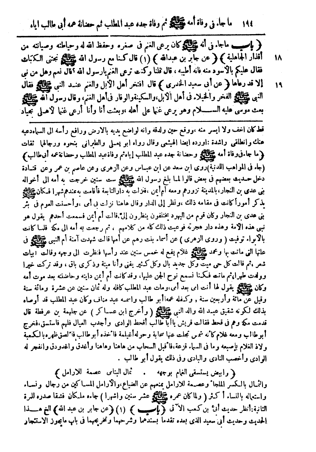 قط كان أخف ولا أيسر منه، ووقع حين ولدقه وانه لواضع يديه بالارض ورافع رأسه الى السماء دعيه عنك وانطلقى راشدة: اورده ايضًا الهثمى وقال رواه ابو يعلى والطيرانى بنحوه ورجالها ثقات (ما جاء في وفاة أمه صلى الله عليه وسلم وحضانة جده عبد المطلب إباه ثم وفاة عبد المطلب وحضانة عمه أبى طالب) (جاء في المواهب اللدينة) روى ابن سعد عن ابن عباس وعن الزهرى وعن عاصم بن عمر وعن قتادة دخل حديث بعضهم في بعض قالوا لما بلغ رسول الله صلى الله عليه وسلم ست سنين خرجت به أمه الى أخواله بنى عدى بن النجار، بالمدينة تزورهم ومعه أم أيمن، فنزلت به دار التابعة فأقامت به عندهم شهرا فكان صلى الله عليه وسلم يذكر أمورًا كانت في مقامه ذلك، ونظر إلى الدار وقال ها هنا نزلت بى أمى، وأحسنت العوم في بئر بنى عدى بن النجار وكان قوم من اليهود يختلفون ينظرون إلى وقالت أم أيمن فسمعت أحدهم يقول هو نبى الأمة وهذه دار هجرته فوعيت ذلك كله من كلامهم، ثم رجعت به أمه الى مكة فلما كانت بالأبواء توفيت (وروى الزهرى) عن أسماء بنت رهم عن أمها قالت شهدت آمنة أم النبي صلى الله عليه وسلم في علتها التى ماتت ومحمد صلى الله عليه وسلم غلام يفع له خمس سنين عند رأسها فنظرت الى وجهه وقالت ابيات شعر، ثم قالت كل حي ميت وكل جديد بال وكل كثير يفنى وأنا ميتة وذكرى باق، وقد تركت خيرًا وولدت طهرا، ثم ماتت فكنا نسمع نوح الجن عليها، وقد كانت أم أيمن دايته وحضانته بعد موت أمه وكان صلى الله عليه وسلم يقول لها أنت امى بعد أمى، ومات عبد المطلب كافله وله ثمان سنين من عشرة ومائة سنة وقيل عن مائة وأربعين سنة. وكفله عمه أبو طالب واسمه عبد مناف وكان عبد المطلب قد أوصاه بذلك لكونه شقيق عبدالله والد النبي صلى الله عليه وسلم (وأخرج ابن عساكر) عن جلهمة بن عرفطة قال قدمت مكة وهم في قحط فقالت قريش يا أبا طالب أقحت الوادى وأجدب العيال فلهم فاستسق، فخرج أبو طالب ومعه غلام كأنه شمس تجلت عنها صحابة وحوله أغيلمة فأخذه أبو طالب فألصق ظهره بالكعبة ولاذ الغلام بإصبعه وما في السماء قزعة، فأقبل السحاب من ها هنا وأغدق وأغدو دق وانفجر له الوادى وأخصب النادى والبادى وفي ذلك يقول أبو طالب. (وابيض يستسقى الغمام بوجهه. ثمال اليتامى عصمة للارامل) والثمال بالكسر الملجأ وعصمة للارامل يمنعهم عن الضياع، والأرامل المساكين من رجال ونساء واستعماله بالنساء أكثر (ولما كان عمره صلى الله عليه وسلم عشر سنين واشهرا) جاءه ملكان فشقا صدره للمرة الثانية: أنظر حديث ابى بن كعب الآتى (باب) (1) (عن جابر بن عبد الله) الخ هذا الحديث وحديث أبى سعيد الذي بعده تقدما بسندهما وشرحهما وتخريجهما في باب ما يجوز الاستئجار