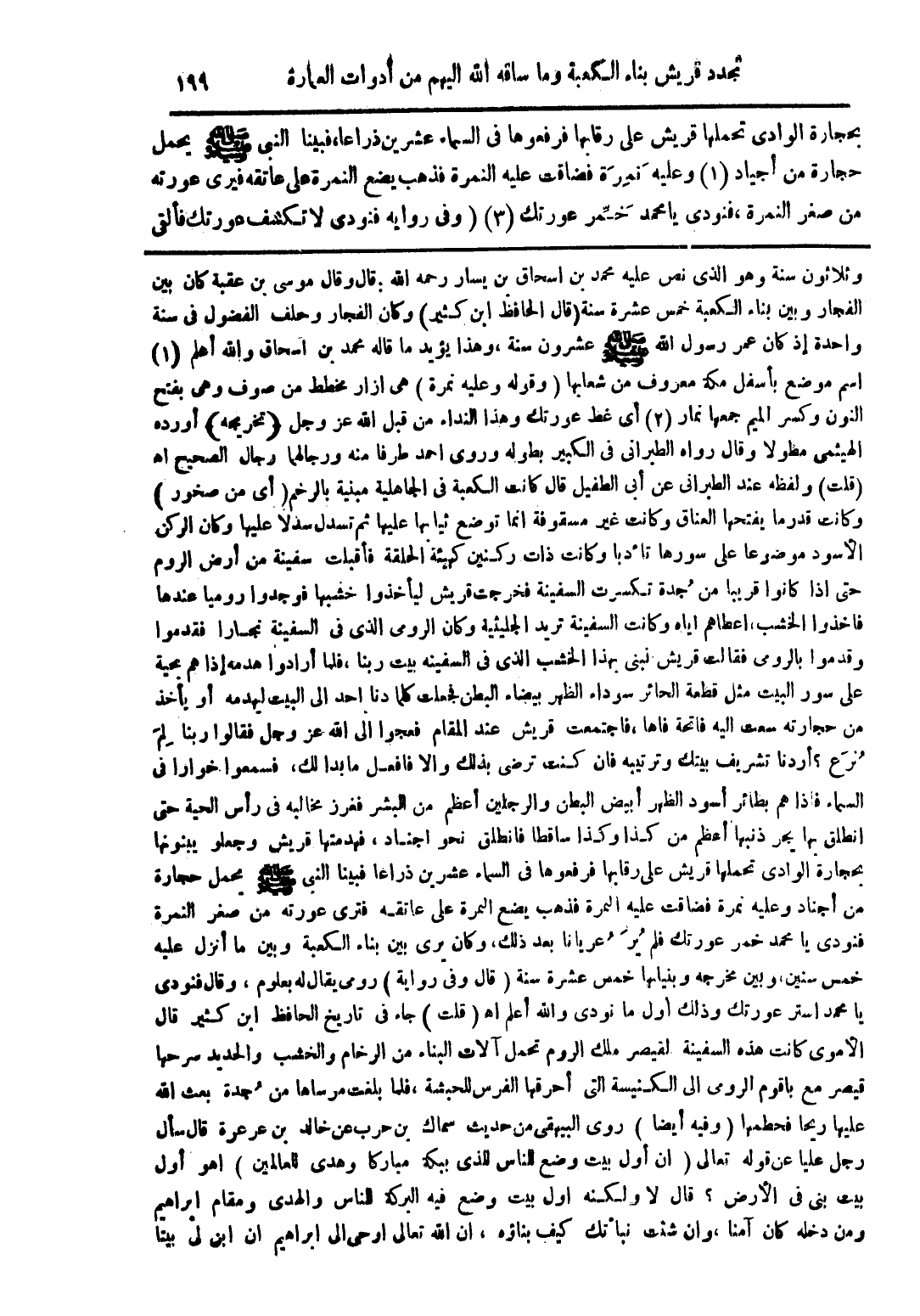 وثلاثون سنة وهو الذي نص عليه محمد بن اسحاق بن يسار رحمه الله: قال وقال موسى بن عقبة كان بين الفجار وبين بناء الكعبة خمس عشرة سنة (قال الحافظ ابن كثير) وكان الفجار وحلف الفضول في سنة واحدة إذ كان عمر رسول الله صلى الله عليه وسلم عشرون سنة، وهذا يؤيد ما قاله محمد بن اسحاق والله أعلم (1) اسم موضع بأسفل مكة معروف من شعابها (وقوله وعليه نمرة) هي ازار مخطط من صوف وهي بفتح النون وكسر الميم جمعها نمار (2) أى غط عورتك وهذا النداء من قبل الله عز وجل (تخريجه) أورده الهيثمى مظولا وقال رواه الطيرانى في الكبير بطوله وروى احد طرفا منه ورجالهما رجال صحيح اه (قلت) ولفظه عند الطيرانى عن أبى الطفيل قال كانت الكعبة في الجاهلية مبنية بالرخم (أى من صخور) وكانت قدر ما يفتحها العناق وكانت غير مسقوفة انما توضع ثيابها ثم تسدل سدلا عليها وكان الركن الأسود موضوعًا على سورها تأدبا وكانت ذات ركنين كهيئة الحلقة فأقبلت سفينة من أرض الروم حتى اذا كانوا قريبا من جدة تكسرت السفينة فخرجت قريش ليأخذوا خشبها فوجدوا روميا عندها فاخذوا الخشب، اعطاهم اياه وكانت السفينة تريد الجليثية وكان الرومى الذي في السفينة نجارا فقدموا وقدموا بالرومى فقالت قريش نبنى بهذا الخشب الذي في السفينة بيت ربنا، فلما أرادوا هدمه إذا هم بحية على سور البيت مثل قطعة الحائر سوداء الظهر بيضاء البطن فجعلت كلما دنا احد الى البيت لهدمه أو يأخذ من حجارته سعت اليه فاتحة فامها، فاجتمعت قريش عند المقام فمجوا الى الله عز وجل فقالوا ربنا لم نزع؟ أردنا تشريف بيتك وترتيبه فان كنت ترضى بذلك والا فافعل ما بدا لك، فسمعوا اخوارا في السماء فاذا هم أسود الظهر وأبيض البطن والرجلين أعظم من البشر فغزز في رأس الحية حتى انطلق بها يجر ذنبها أعظم من كذا وكذا ساقطا فانطلق نحو اجناد، فهدمتها قريش وجعلو يبنونها بحجارة الوادى تحملها قريش على رقابها فرفعوها في السماء عشرين ذراعًا فبينا النبي صلى الله عليه وسلم محمل حجارة من أجناد وعليه نمرة فضاقت عليه المرة فذهب يضع المرة على عانقه فترى عورته من صغر النمرة فنودى يامحمد خمر عورتك فلم ير عريانا بعد ذلك، وكان يرى بين بناء الكعبة وبين ما أنزل عليه خمس سنين، وبين مخرجه وبنياها خمس عشرة سنة (قال وفي رواية) رومى يقال له بعلوم، وقال فنودى يا محمد استر عورتك وذلك اول ما نودى والله أعلم اه (قلت) جاء في تاريخ الحافظ ابن كثير قال الأموى كانت هذه السفينة لقيصر ملك الروم تحمل آلات البناء من الرخام والخشب والحديد سرحها قيصر مع القوم الرومى الى الكنيسة التي أحرقها الفرس للحبشة، فلما بلغت مرساها من جدة بعث الله عليها ريحا فحطمها (وفيه أيضا) روى البيهقى من حديث سماك بن حرب عن خالد بن عرعرة قال سأل رجل عليا عن قوله تعالى (ان أول بيت وضع للناس الذى ببكة مباركا وهدى للعالمين) اهو أول بيت بنى في الأرض؟ قال لا ولكنه اول بيت وضع فيه البركة للناس والهدى ومقام ابراهيم ومن دخله كان آمنا، وان شئت نباتك كيف بناؤه، ان الله تعالى اوحى إلى إبراهيم أن ابن لي بيتا