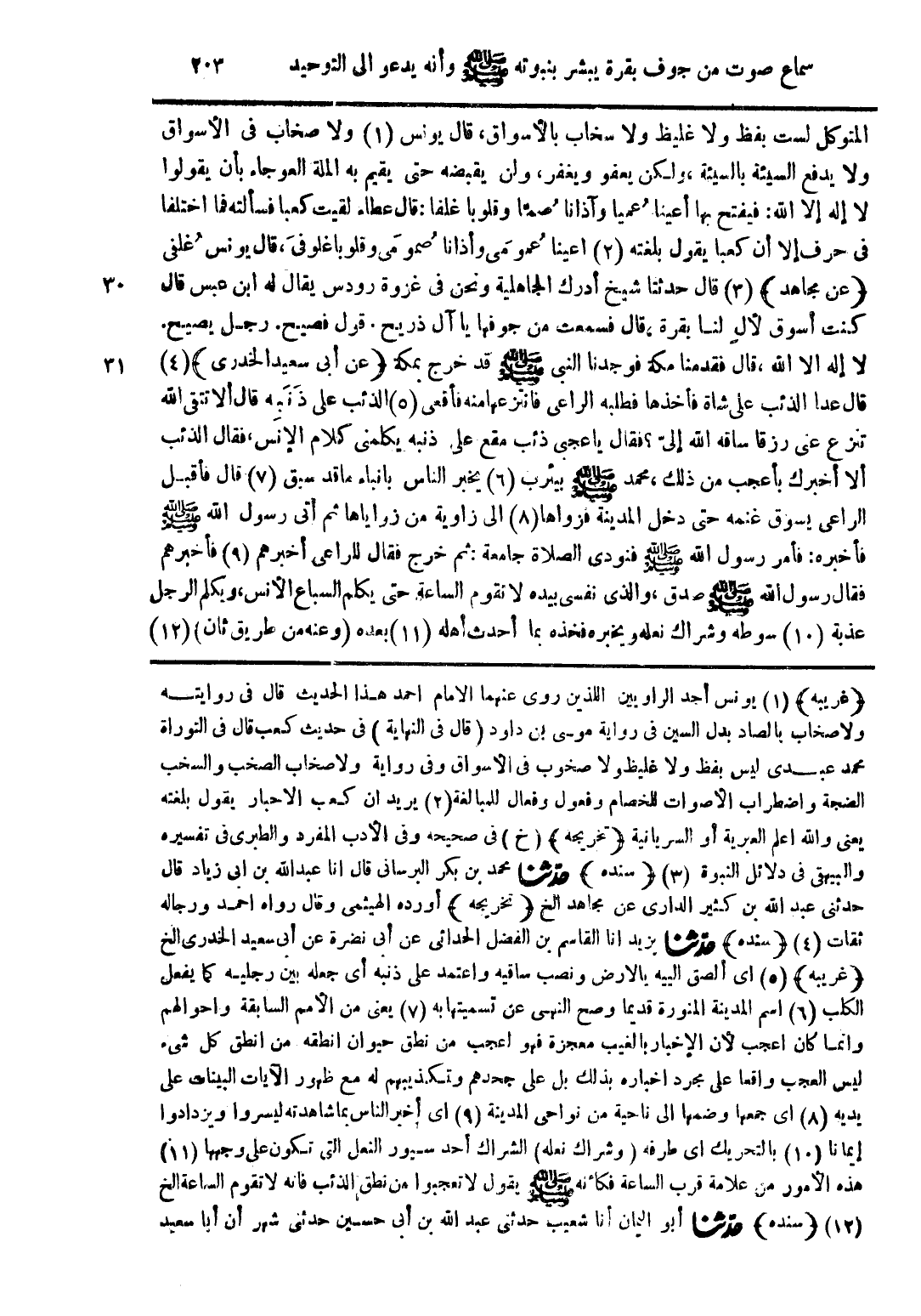 (غريبه) (1) يونس أحد الراويين اللذين روى عنهما الامام احمد هذا الحديث قال في روايته ولاصخاب بالصاد بدل السين في رواية موسى بن داود (قال في النهاية) في حديث كعب قال في التوراة محمد عبدى ليس بفظ ولا غليظ لا صخوب في الأسواق وفي رواية ولا صخاب الصخب والسخب الضجة واضطراب الأصوات الخصام وفعول وفعال للمبالغة (2) يريد ان كعب الاحبار يقول بلغته يعنى والله اعلم العبرية أو السريانة (تخريجه) (خ) في صحيحه وفي الأدب المفرد والطبرى في تفسيره والبيهقى في دلائل النبوة (3) (سنده) حدثنا محمد بن بكر البرسانى قال انا عبدالله بن ابى زياد قال حدثنى عبدالله بن كثير الدارى عن مجاهد الخ (تخريجه) أورده الهيثمى وقال رواه احمد ورجاله ثقات (4) (سنده) حدثنا يزيد انا القاسم بن الفضل الحدائى عن أبى نضرة عن أبى سعيد الخدرى الخ (غريبه) (5) اى ألصق الييه بالارض ونصب ساقيه واعتمد على ذنبه أى جعله بين رجليه كما يفعل الكلب (6) اسم المدينة المنورة قديما وصح النهى عن تسميتها به (7) يعنى من الأمم السابقة واحوالهم وانما كان اعجب لأن الإخبار بالغيب معجزة فهو اعجب من نطق حيوان انطقه من انطق كل شيء ليس العجب واقعا على مجرد اخباره بذلك بل على جحدهم وتكذيبهم مع ظهور الآيات البينات على يديه (8) اى جمعها وضمها الى ناحية من نواحى المدينة (9) اى أخبر الناس بما شاهدته ليسروا ويزدادوا إيمانا (10) بالتحريك اى طرفه (وشراك نعله) الشراك أحد سيور النعل التى تكون على وجهها (11) هذه الأمور من علامة قرب الساعة فكأنه صلى الله عليه وسلم يقول لا تعجبوا من نطق الذئب فأنه لا تقوم الساعة الخ (12) (سنده) حدثنا أبو اليمان أنا شعيب حدثنى عبدالله بن أبى حسين حدثنى شهر أن أبا سعيد