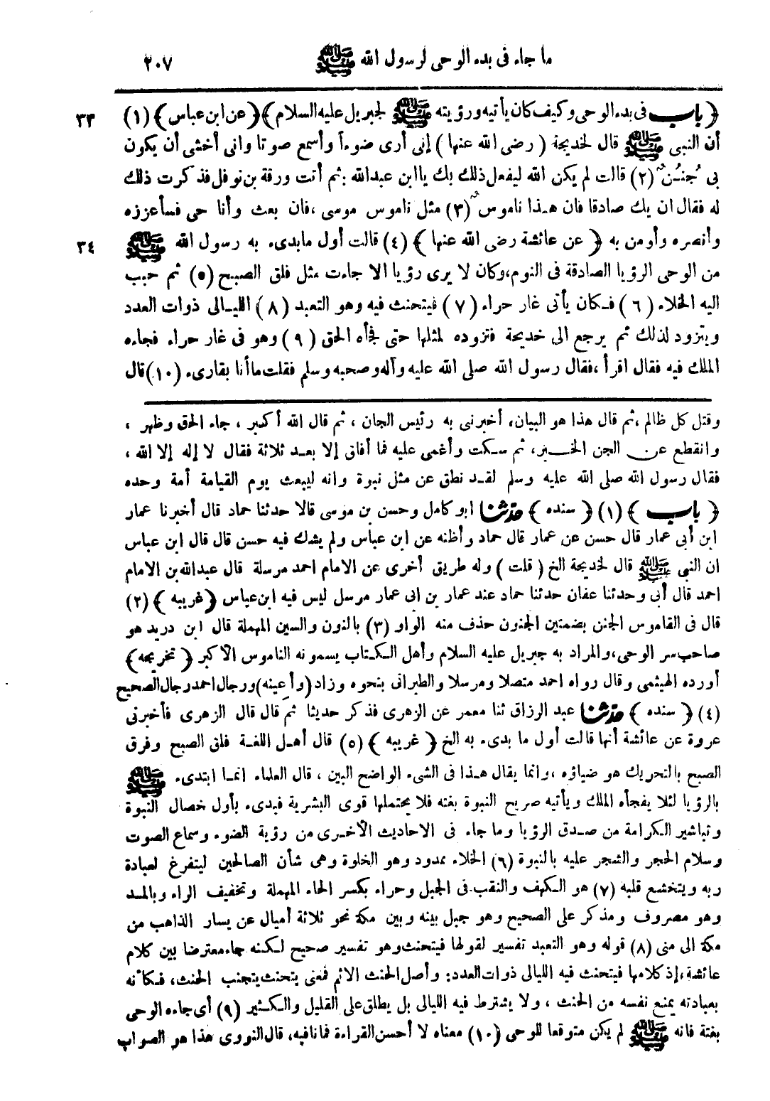 (باب) (1) (سنده) حدّثنا ابو كامل وحسن بن موسى قالا حدثنا حماد قال أخبرنا عمار ابن أبى عمار قال حسن عن عمار قال حماد وأظنه عن ابن عباس ولم يشك فيه حسن قال قال ابن عباس ان النبى صلى الله عليه وسلم قال لخديجة الخ (قلت) وله طريق أخرى عن الامام احمد مرسلة قال عبد الله بن الامام احمد قال أبى وحدثنا عفان حدثنا حماد عند عمار بن ابى عمار مرسل ليس فيه ابن عباس (غريبه) (2) قال فى القاموس الجنن بضمتين الجنون حذف منه الواو (3) بالنون والسين المهملة قال ابن دريد هو صاحب سر الوحى، والمراد به جبريل عليه السلام وأهل الكتاب يسمونه الناموس الأكبر (تخريجه) أورده الهيثمى وقال رواه احمد متصلا ومرسلا والطبرانى بنحوه وزاد (وأعينه) ورجال احمد رجال الصحيح (4) (سنده) حدّثنا عبد الرازق ثنا معمر عن الزهرى فذكر حديثا ثم قال قال الزهرى فأخبرنى عروة عن عائشة أنها قالت أول ما بدئ به الخ (غريبه) (5) قال أهل اللغة فلق الصبح وفرق الصبح بالتحريك هو ضياؤه، وانما يقال هذا فى الشئ الواضح البين، قال العلماء انما ابتدئ صلى الله عليه وسلم بالرؤيا لئلا يفجأه الملك ويأتيه صريح النبوة بغته فلا يحتملها قوى البشرية فبدئ بأول خصال النبوة وتباشير الكرامة من صدق الرؤيا وما جاء فى الاحاديث الأخرى من رؤية الضوء وسماع الصوت وسلام الحجر والشجر عليه بالنبوة (6) الخلاء ممدود وهو الخلوة وهى شأن الصالحين ليتفرغ لعبادة ربه ويتخشع قلبه (7) هو الكهف والنقب فى الجبل وحراء بكسر الحاء المهملة وتخفيف الراء وبالمد وهو مصروف ومذكر على الصحيح وهو جبل بينه وبين مكة نحو ثلاثة أميال عن يسار الذاهب من مكة الى منى (8) قوله وهو التعبد تفسير لقولها فيتحنث وهو تفسير صحيح لكنه جاء معترضا بين كلام عائشة، إذ كلامها فيتحنث فيه الليالى ذوات العدد: وأصل الحنث الائم فمعنى يتحنث الحنث، فكأنه بعبادته يمنع نفسه من الحنث، ولا يشترط فيه الليالى بل يطلق على القليل والكثير (9) أى جاءه الوحى بغتة فانه صلى الله عليه وسلم لم يكن متوقعا للوحى (10) معناه لا أحسن القراءة فما نا فيه، قال النووى هذا هو الصواب