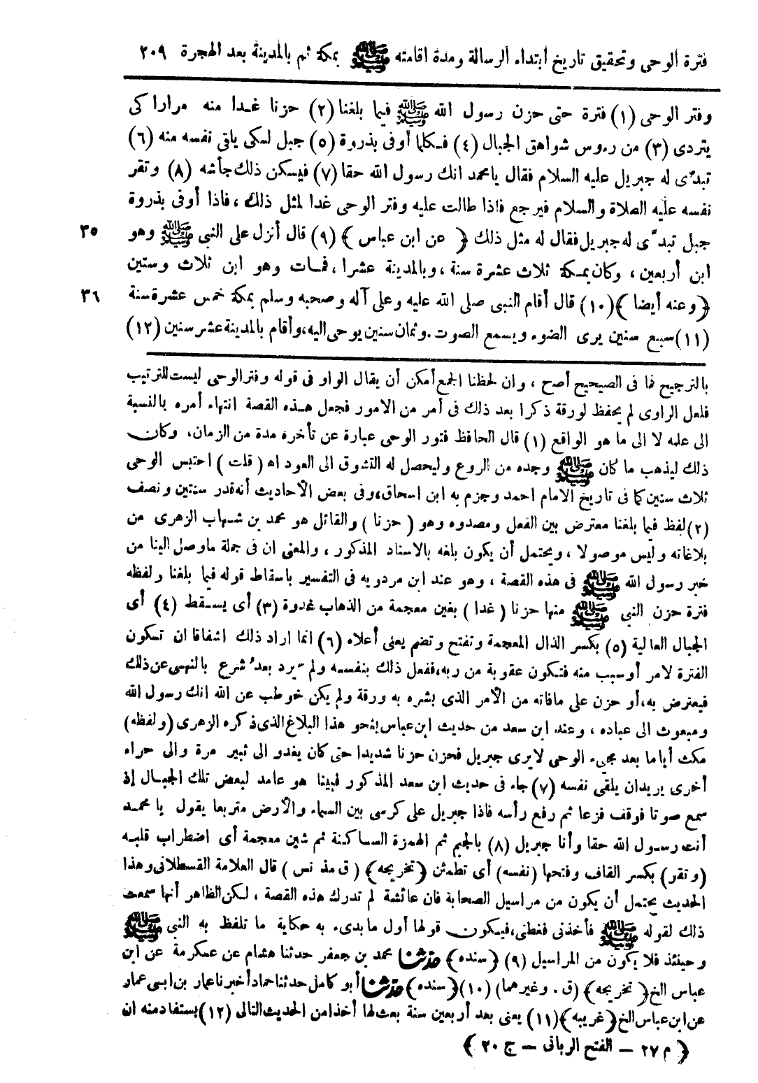 وفتر الوحي فترة حتى حزن رسول الله صلى الله عليه وسلم فيما بلغنا حزنا غدا منه مرارا كى يتردى من رءوس شواهق الجبال فكلما أوفى بذروة جبل لكى يلقى نفسه منه تبدّى له جبريل عليه السلام فقال يا محمد انك رسول الله حقا فيسكن ذلك جأشه وتقر نفسه عليه الصلاة والسلام فيرجع فاذا طالبت عليه وفتر الوحى غدا لمثل ذلك، فاذا أوفى بذروة جبل تبدّى له جبريل فقال له مثل ذلك (عن ابن عباس) قال أنزل على النبى صلى الله عليه وسلم وهو ابن أربعين، وكان بمكة ثلاث عشرة سنة، وبالمدينة عشرا، فمات وهو ابن ثلاث وستين (وعنه أيضا) قال أقام النبى صلى الله عليه وعلى آله وسلم بمكة خمس عشرة سنة سبع سنين يرى الضوء ويسمع الصوت. وثمان سنين يوحى اليه، وأقام بالمدينة عشر سنين