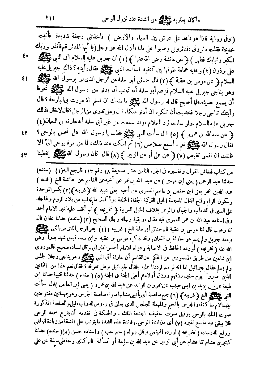 (وفي رواية فاذا هو قاعد على عرش بين السماء والأرض) فأخذتنى رجفة شديدة فأتيت خديجة فقلت دثرونى: فدثرونى وصبوا على ماءا فأنزل الله عز وجل {يا أيها المدثر قم فأنذر وربك فكبر وثيابك فطهر} (عن عائشة رضي الله عنها) ان جبريل عليه السلام اتى النبى صلى الله عليه وسلم على برذون وعليه عمامة طرفها بين كتفيه فسألت النبى صلى الله عليه وسلم فقال رأيته؟ ذاك جبريل عليه السلام (عن موسى بن عقبة) قال حدثنى أبو سلمة عن الرجل الذى مر برسول الله صلى الله عليه وسلم وهو يناجى جبريل عليه السلام فزعم أبو سلمة أنه تجنب أن يدنو من رسول الله صلى الله عليه وسلم تخوفا أن يسمع حديثه، فلما أصبح قال له رسول الله صلى الله عليه وسلم ما منعك ان تسلم اذ مررت بى البارحة؟ قال رأيتك تناجى رجلا فخشيت أن تكره ان أدنو منكما، قال وهل تدرى من الرجل؟ قال لا، قال فذلك جبريل عليه السلام، ولو سلمت لرد السلام، وقد سمعت من غير أبى سلمة أنه حارثه بن النعمان (عن عبد الله بن عمرو) قال سألت النبى صلى الله عليه وسلم فقلت يا رسول الله هل تحس بالوحى؟ فقال رسول الله صلى الله عليه وسلم نعم، أسمع صلاصل ثم اسكت عند ذلك، فما من مرة يوحى الى الا ظننت ان نفسى تقبض (عن على أو عن الزبير) قال كان رسول الله صلى الله عليه وسلم يخطبنا