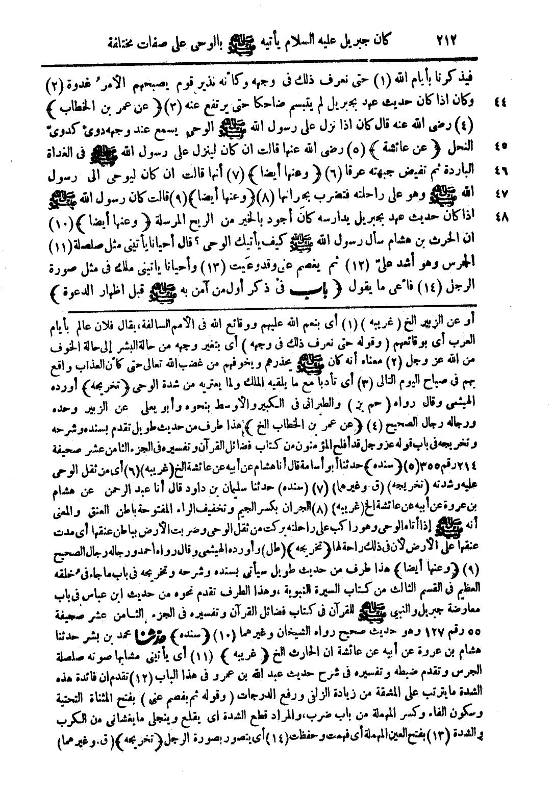 أو عن الزبير الخ (غريبه) (1) أى بنعم الله عليهم ووقائع الله فى الأمم السالفة، يقال فلان عالم بأيام العرب أى بوقائعهم (وقوله حتى نعرف ذلك فى وجهه) أى بتغير وجهه من حالة البشر إلى حالة الخوف من الله عز وجل (2) معناه أنه كان صلى الله عليه وسلم يحذرهم ويخوفهم من غضب الله تعالى حتى كأن العذاب واقع بهم فى صباح اليوم التالى (3) أى تأدبا مع ما يلقيه الملك ولما يعتريه من شدة الوحى (تخريجه) أورده الهيثمى وقال رواه (حم بز) والطبرانى فى الكبير والأوسط بنحوه وأبو يعلى عن الزبير وحده ورجاله رجال الصحيح (4) (عن عمر بن الخطاب الخ) هذا طرف من حديث طويل تقدم بسنده وشرحه وتخريجه فى باب قوله عز وجل قد أفلح المؤمنون من كتاب فضائل القرآن وتفسيره فى الجزء الثامن عشر صحيفة 214 رقم 355 (5) (سنده) حدثنا أبو أسامة قال أنا هشام عن أبيه عن عائشة الخ (غريبه) (6) أى من ثقل الوحى عليه وشدته (تخريجه) (ق وغيرهما) (7) (سنده) حدثنا سليمان بن داود قال أنا عبد الرحمن عن هشام بن عروة عن أبيه عن عائشة الخ (غريبه) (8) الجران بكسر الجيم وتخفيف الراء المفتوحة باطن العنق والمعنى أنه صلى الله عليه وسلم إذا أتاه الوحى وهو راكب على راحلته بركت من ثقل الوحى وضربت الأرض بباطن عنقها أى مدت عنقها على الأرض لأن فى ذلك راحة لها (تخريجه) (طل) وأورده الهيثمى وقال رواه أحمد ورجاله رجال الصحيح (9) (وعنها أيضا) هذا طرف من حديث طويل سيأتى بسنده وشرحه وتخريجه فى باب ما جاء فى خلقه العظيم فى القسم الثالث من كتاب السيرة النبوية، وهذا الطرف تقدم نحوه من حديث ابن عباس فى باب معارضة جبريل والنبي صلى الله عليه وسلم للقرآن فى كتاب فضائل القرآن وتفسيره فى الجزء الثامن عشر صحيفة 55 رقم 127 وهو حديث صحيح رواه الشيخان وغيرهما (10) (سنده) حدّثنا محمد بن بشر حدثنا هشام بن عروة عن أبيه عن عائشة ان الحارث الخ (غريبه) (11) أى يأتينيى مشابها صوته صلصلة الجرس وتقدم ضبطه وتفسيره فى شرح حديث عبد الله بن عمرو فى هذا الباب (12) تقدم ان فائدة هذه الشدة ما يترتب على المشقة من زيادة الزلفى ورفع الدرجات (وقوله ثم يفصم عنى) بفتح المثناة التحتية وسكون الفاء وكسر المهملة من باب ضرب، والمراد قطع الشدة اى يقلع وينجلى ما يغشانى من الكرب والشدة (13) بفتح العين المهملة أى فهمت وحفظت (14) أى يتصور بصورة الرجل (تخريجه) (ق. وغيرهما)