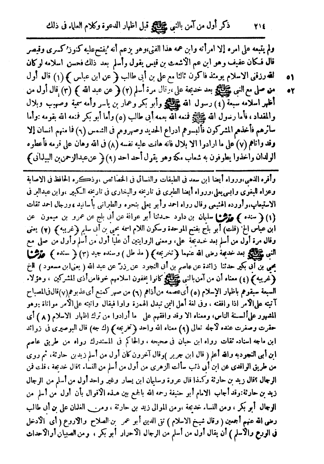 وأقره الذهبي، ورواه أيضا ابن سعد فى الطبقات والنسائى فى الخصائص، وذكره الحافظ فى الاصابة وعزاه البغوى وابى يعلى، ورواه أيضا الطبرى فى تاريخه والبخارى فى تاريخه الكبير، وابن عبد البر فى الاستيعاب، وأورده الهيثمى وقال رواه احمد وأبو يعلى بنحوه والطبرانى بأسانيد، ورجال احمد ثقات (1) (سنده) حدّثنا سليمان بن داود حدثنا أبو عوانة عن أبى بلج عن عمرو بن مسمون عن ابن عباس الخ (قلت) أبو بلح بفتح الموحدة وسكون اللام اسمه يحيى بن أبى سليم (غريبه) (2) يعنى وقال مرة أول من أسلم بعد خديجة على، ومعنى الروايتين أن عليا أول من أسلم وأول من صلى مع النبى صلى الله عليه وسلم بعد خديجة رضي الله عنهما (تخريجه) (مذ طل) وسنده جيد (3) (سنده) حدّثنا يحيى بن أبى بكير حدثنا زائدة عن عاصم بن أبى النجود عن زرّ عن عبد الله (يعنى ابن مسعود) الخ (غريبه) (4) معناه أن من آمن بالنبى صلى الله عليه وسلم كانوا يخفون اسلامهم خوفا من أذى المشركين، وهؤلاء السبعة سبقوهم باظهار الإسلام (5) أى عصمه من أذاهم (6) من صهر كمنع أبى عذبوهم (7) قال فى المصباح آتيته على الأمر اذا وافقته، وفى لغة أهل اليمن تبدل الهمزة واوا فيقال واتيته على الأمر مواتاة: وهو المشهور على ألسنة الناس، ومعناه الا وقد وافقهم على ما أرادوا من ترك اظهار الاسلام (8) أى حقرت وصغرت عنده لأجله تعالى (9) معناه الله واحد (تخريجه) (ك جه) قال البوصيرى فى زوائد ابن ماجه اسناده ثقات رواه ابن حيان فى صحيحه، والحاكم فى المستدرك رواه من طريق عاصم ابن أبى النجودبه والله أعلم (قال ابن جرير) وقال آخرون كان أول من أسلم زيد بن حارثة، ثم روى من طريق الواقدى عن ابن أبى ذئب سألت الزهرى من أول من أسلم من النساء؟ قال خديجة، قلت فمن الرجال؟ قال زيد بن حارثة وكذا قال عروة وسليمان ابن يسار وغير واحد أول من أسلم من الرجال زيد بن حارثة: وقد أجاب الامام أبو حنيفة رحمه الله بالجمع بين هذه الأقوال بأن أول من أسلم من الرجال أبو بكر، ومن النساء خديجة، ومن الموالى زيد بن حارثة، ومن الغلمان على بن أبى طالب رضي الله عنهم أجمعين (وقال شيخ الاسلام) تقى الدين أبو عمر بن الصلاح والأروع (أى الأدخل فى الورع والأسلم) أن يقال أول من أسلم من الرجال الأحرار أبو بكر، ومن الصبيان أو الأحداث