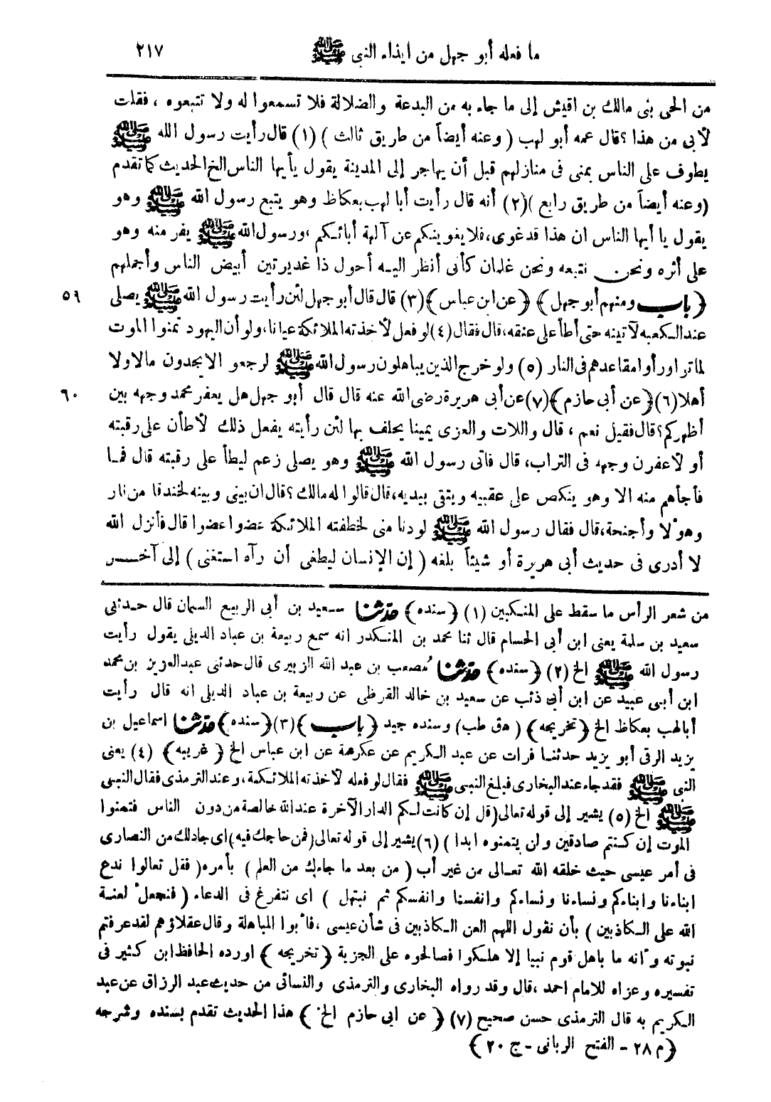 من شعر الرأس ما سقط على المنكبين (1) (سنده) حدّثنا سعيد بن أبى الربيع السمان قال حدثنى سعيد بن سلمة يعنى ابن أبى الحسام قال ثنا محمد بن المنكدر انه سمع ربيعة بن عباد الديلي يقول رأيت رسول الله صلى الله عليه وسلم الخ (2) (سنده) حدّثنا مصعب بن عبد الله الزبيرى قال حدثنى عبد العزيز بن محمد ابن أبى عبيد عن ابن أبى ذئر عن سعيد بن خالد القرظى عن ربيعة بن عباد الديلى انه قال رأيت أبا لهب بعكاظ الخ (تخريجه) (هق طب) وسنده جيد (باب) (3) (سنده) حدّثنا اسماعيل بن يزيد الرقى أبو يزيد حدثنا فرات عن عبد الكريم عن عكرمة عن ابن عباس الخ (غريبه) (4) يعنى النبى صلى الله عليه وسلم فقد جاء عند البخارى فبلغ النبى صلى الله عليه وسلم فقال لو فعله لأخذته الملائكة، وعند الترمذى فقال النبى صلى الله عليه وسلم الخ (5) يشير إلى قوله تعالى {قل إن كانت لكم الدار الآخرة عند الله خالصة من دون الناس فتمنوا الموت إن كنتم صادقين ولن يتمنوا ابدا} (6) يشير إلى قوله تعالى {فمن حاجك فيه} اي جادلك من النصارى فى أمر عيسى حيث خلقه الله تعالى من غير أب {من بعد ما جاءك من العلم} بأمره {فقل تعالوا ندع ابناءنا وابناءكم ونساءنا ونساءكم وانفسنا وانفسكم ثم نبتهل} اى نتفرغ فى الدعاء {فنجعل لعنة الله على الكاذبين} بأن نقول اللهم العن الكاذبين فى شأن عيسى، فأبوا المباهلة وقال عقلاؤهم لقد عرفتم نبوته وأنه ما باهل قوم نبيا إلا هلكوا فصالحوه على الجزية (تخريجه) اورده الحافظ ابن كثير فى تفسيره وعزاه للامام احمد، قال وقد رواه البخارى والترمذي والنسائى من حديث عبد الرازق عن عبد الكريم به قال الترمذى حسن صحيح (7) (عن ابى حازم الخ) هذا الحديث تقدم بسنده وشرحه