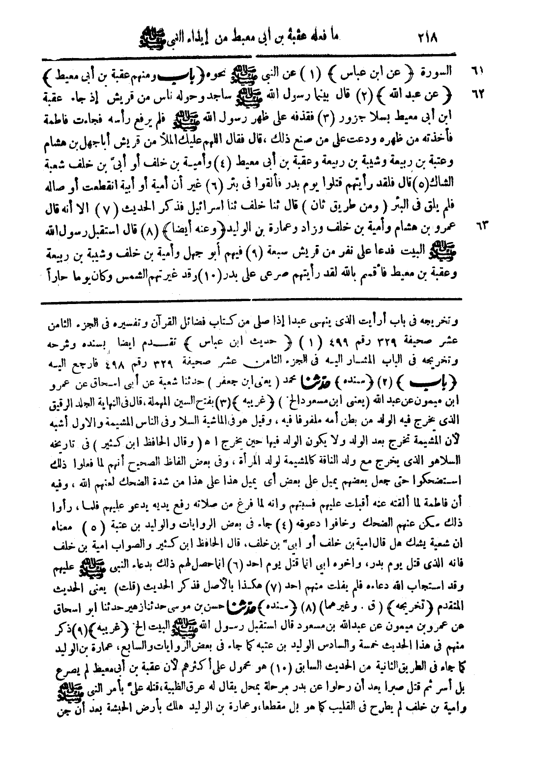 السورة (عن ابن عباس) عن النبى صلى الله عليه وسلم نحوه (باب ومنهم عقبة بن أبى معيط) (عن عبد الله) قال بينما رسول الله صلى الله عليه وسلم ساجد وحوله ناس من قريش إذ جاء عقبة ابن أبى معيط بلا جزور فقذفه على ظهر رسول الله صلى الله عليه وسلم فلم يرفع رأسه فجاءت فاطمة فأخذته من ظهره ودعت على من صنع ذلك، قال فقال الله معليك الملأ من قريش أبا جهل بن هشام وعتبة بن ربيعة وشيبة بن ربيعة وعقبة بن أبى معيط وأمية بن خلف أو أبى بن خلف شعبة الشاك قال فلقد رأيتهم قتلوا يوم بدر فألقوا فى بئر غير أن أمية أو أبية انقطعت أوصاله فلم يلق فى البئر (ومن طريق ثان) قال ثنا خلف ثنا اسرائيل فذكر الحديث الا أنه قال عمرو بن هشام وأمية بن خلف وزاد وعمارة بن الوليد (وعنه أيضا) قال استقبل رسول الله صلى الله عليه وسلم البيت فدعا على نفر من قريش سبعة فيهم أبو جهل وأمية بن خلف وشيبة بن ربيعة وعقبة بن معيط فأقسم بالله لقد رأيتهم صرعى على بدر وقد غيرتهم الشمس وكان يوما حارًا