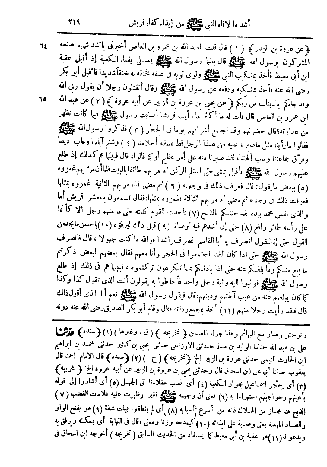 وتوحش وصار مع البهائم وهذا جزاء المعتدين (تخريجه) (ق، وغيرها) (1) (سنده) حدّثنا على بن عبد الله حدثنا الوليد بن مسلم حدثنى الاوزاعى حدثنى يحيى بن كثير حدثنى محمد بن ابراهيم ابن الحارث التيمى حدثنى عروة بن الزبير الخ (تخريجه) (خ) (2) (سنده) قال الامام احمد قال يعقوب حدثنا أبى عن ابن اسحاق قال وحدثنى يحيى بن عروة بن الزبير عن أبيه عروة الخ (غريبه) (3) أى حجر اسماعيل بجوار الكعبة (4) أى نسب عقلاءنا الى الجهل (5) أى أشاروا إلى قوله بأعينهم وحواجبهم استهزاءا به (6) يعنى أن وجهه صلى الله عليه وسلم تغير وظهرت عليه علامات الغضب (7) الذبح هنا مجاز من الهلاك فانه من أسرع أسبابه (8) أي لم ينطقوا ببنت شفة (9) هو بفتح الواو والصاد المهملة يعنى وصية على ايذائه (10) كيمدحه وزنا ومعنى، قال فى النهاية أى يسكنه ويرفق به ويدعو له (11) هو عقبة بن أبى معيط كما يستفاد من الحديث السابق (تخريجه) أخرجه ابن اسحاق في