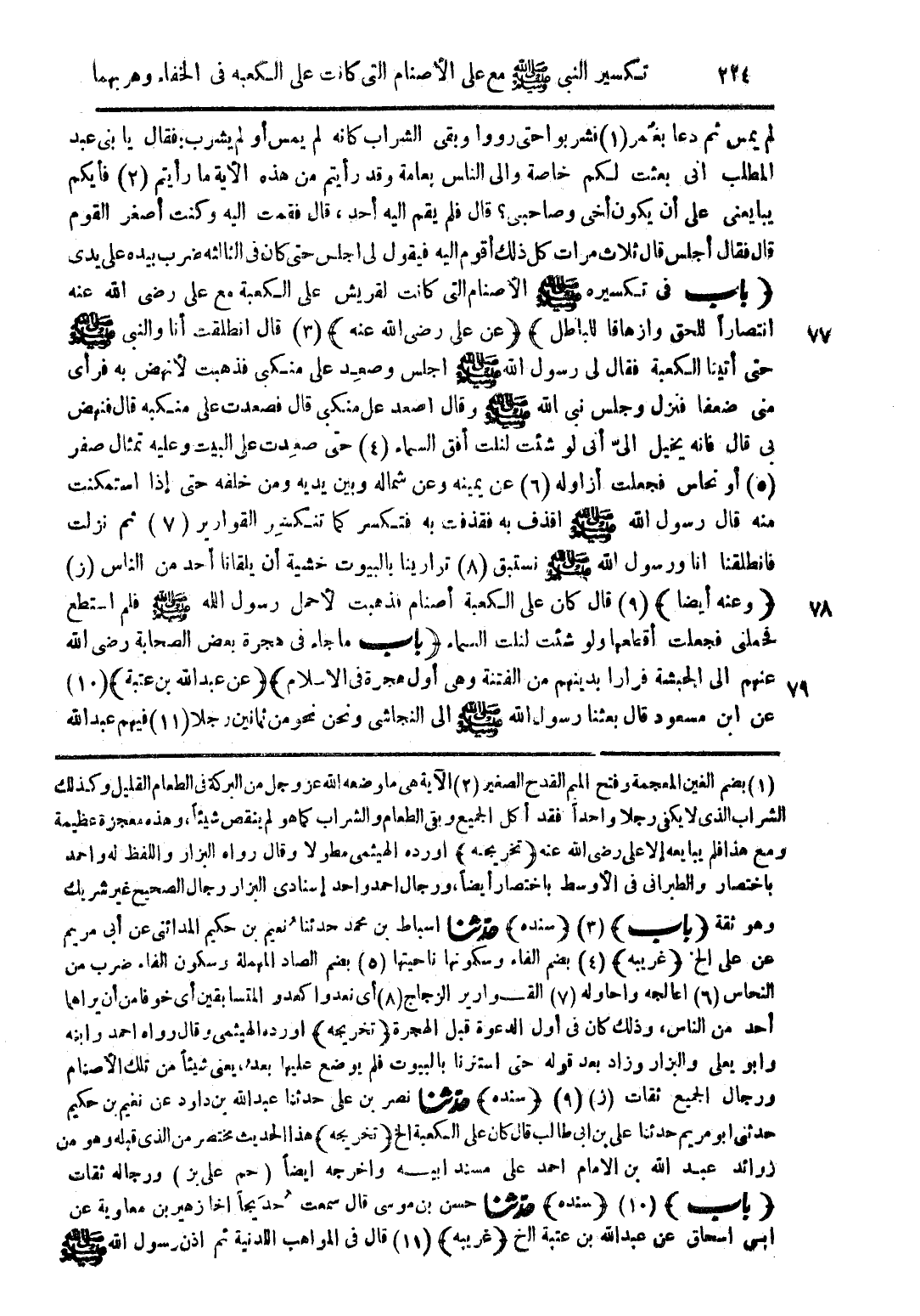 (1) بضم الغين المعجمة وفتح الميم القدح الصغير (2) الآية هى ما وضعه الله عز وجل من البركة فى الطعام القليل وكذلك الشراب الذى لا يكفى رجلا واحدًا فقد أكل الجميع وبقى الطعام والشراب كما هو لم ينقص شيئًا، وهذه معجزة عظيمة ومع هذا فلم يبايعه إلا على رضي الله عنه (تخريجه) اورده الهيثمى مطولا وقال رواه البزار واللفظ له واحمد باختصار والطبرانى فى الأوسط باختصار أيضًا، ورجال احمد واحد إسنادى البزار رجال الصحيح غير شريك وهو ثقة (باب) (3) (سنده) حدّثنا اسباط بن محمد حدثنا نعيم بن حكيم المدائنى عن أبى مريم عن على الخ (غريبه) (4) بضم الفاء وسكونها ناحيتها (5) بضم الصاد المهملة وسكون الفاء ضرب من النحاس (6) اعالجه واحاوله (7) القوارير الزجاج (8) أى نعدوا كعدو المتسابقين أى خوفا من أن يراهما أحد من الناس، وذلك كان فى أول الدعوة قبل الهجرة (تخريجه) اورده الهيثمى وقال رواه احمد وابنه وابو يعلى والبزار وزاد بعد قوله حتى استترنا بالبيوت فلم يوضع عليها بعد، يعنى شيئًا من تلك الأصنام ورجال الجميع ثقات (ز) (9) (سنده) حدّثنا نصر بن على حدثنا عبد الله بن داود عن نغيم بن حكيم حدثنى ابو مريم حدثنا على ابن ابى طالب قال كان على الكعبة الخ (تخريجه) هذا الحديث مختصر من الذى قبله وهو من زوائد عبد الله بن الامام أحمد على مسند ابيه واخرجه أيضًا (حم على بز) ورجاله ثقات (باب) (10) (سنده) حدّثنا حسن بن موسى قال سمعت حديجًا اخا زهير بن معاوية عن ابى اسحاق عن عبد الله بن عتبة الخ (غريبه) (11) قال فى المواهب اللدنية ثم اذن رسول الله صلى الله عليه وسلم