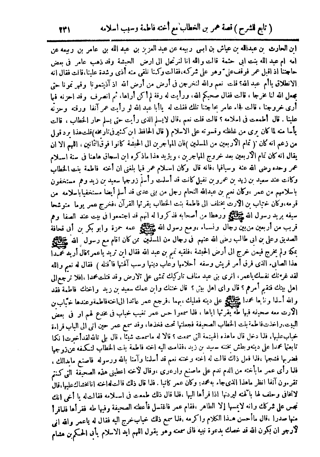 ابن الحارث بن عبد الله بن عياش بن اى ربيعه عن عبد العزيز بن عبد الله بن عامر بن ربيعه عن امه ام عبد الله بنت ابى حثمة قالت والله انا لنرتحل الى ارض الحبشة وقد ذهب عامر فى بعض حاجتنا اذا اقبل عمر فوقف علىّ وهو على شركه، فقالت وكنا نلقى منه أذى وشدة علينا، قالت فقال انه الانطلاق يا أم عبد الله؟ قلت نعم والله لنخرجن فى أرض من أرض الله اذ آذيتمونا وقهرتمونا حتى يجعل الله لنا مخرجا، قالت فقال صحبكم الله، ورأيت له رقة لم أكن أراها، ثم انصرف وقد احزنه فيما أرى خروجنا، قالت فجاء عامر بحاجتنا تلك فقلت له يا أبا عبد الله لو رأيت عمر آنفا ورقته وحزنه علينا. قال أطمعت فى اسلامه؟ قالت نعم، قال لا يسلم الذى رأيت حتى يسلم حمار الخطاب، قالت يأسا منه لما كان يرى من غلظته وقسوته على الاسلام (قال الحافظ ابن كثير فى تاريخه) قلت هذا يرد قول من زعم انه كان (تمام الأربعين من المسلمين) فان المهاجرين الى الحبشة كانوا فوق الثمانين، اللهم الا ان يقال انه كان تمام الأربعين بعد خروج المهاجرين، ويؤيد هذا ما ذكره ابن اسحاق ها هنا فى سنة اسلام عمر وحده رضي الله عنه وسياقها، فانه قال وكان اسلام عمر فيما بلغنى ان أخته فاطمة بنت الخطاب وكانت عند سعيد بن زيد بن عمرو بن نفيل كانت قد أسلمت وأسلم زوجها سعيد بن زيد وهم مستخفون باسلامهم من عمر، وكان نعيم بن عبد الله النحام رجل من بنى عدى قد أسلم أيضا مستخفيا باسلامه من قومه، وكان خبّاب بن الأرت يختلف الى فاطمة بنت الخطاب يقرئها القرآن، فخرج عمر يوما متوشحا سيفه يريد رسول الله صلى الله عليه وسلم ورهطا من أصحابه فذكروا له انهم قد اجتمعوا فى بيت عند الصفا وهم قربب من أربعين من بين رجال ونساء، ومع رسول الله صلى الله عليه وسلم عمه حمزة وابو بكر بن أبى قحافة الصديق وعلى بن ابى طالب رضي الله عنهم فى رجال من السلمين ممن كان اقام مع رسول الله صلى الله عليه وسلم بمكة ولم يخرج فيمن خرج الى أرض الحبشة، فلقيه تميم بن عبد الله فقال اين تريد يا عمر؟ قال أريد محمدا هذا الصابئ الذى فرق أمر قريش وسفه أحلامها وعاب دينها وسب آلهتها فأقتله) فقال له نعيم والله لقد غرّتك نفسك يا عمر، أترى بنى عبد مناف تاركيك تمشى على الارض وقد قتلت محمدا، افلا ترجع الى اهل بيتك فتقيم أمرهم؟ قال واي اهل بيتى؟ قال ختنك وابن عمك سعيد بن زيد واختك فاطمة فقد والله أسلما وتابعا محمدا صلى الله عليه وسلم على دينه فعليك، بهما، فرجع عمر عائدا الى اخته فاطمة وعندها خبّاب بن الأرت معه صحيفه فيها طه يقرئها اياها، فلما سمعوا حس عمر تغيب خباب فى مخدع لهم او فى بعض البيت، واخذت فاطمة بنت الخطاب الصحيفة فجعلتها تحت فخذها، وقد سمع عمر حين اتى الى الباب قراءة خباب عليها، فلما دخل قال ما هذه الهيثمة التى سمعت؟ قالا له ما سمعت شيئا، قال بلى تالله لقد أخبرت انكما تابعتما محمدا على دينه وبطش بختنه سعيد بن زيد، فقامت اليه اخته فاطمة بنت الخطاب لتكفه عن زوجها فضربها فشجها، فلما فعل ذلك قالت له اخته وختنه نعم قد أسلمنا وآمنا بالله ورسوله فاصنع ما بدالك، فلما رأى عمر ما بأخته من الدم ندم على ما صنع وارعوى، وقال لأخته اعطينى هذه الصحيفة التى كنتم تقرءون آنفا انظر ما هذا الذى جاء به محمد: وكان عمر كاتبا. فلما قال ذلك قالت له اخته انا نخشاك عليها، قال لا تخافى وحلف لها بآلهته ليردنها اذا قرأها اليها، فلما قال ذلك طمعت فى اسلامه فقالت له يا أخى انك نجس على شركك وانه لا يمسها إلا الطاهر، فقام عمر فاغتسل فأعطته الصحيفة وفيها طه فقرأها فلما قرأ منها صدرا، قال ما أحسن هذا الكلام واكرمه، فلما سمع ذلك خباب خرج اليه فقال له يا عمر والله انى لأرجو ان يكون الله قد خصك بدعوة نبيه فانى سمعته وهو يقول اللهم ايد الاسلام بأبي الحكم بن هشام