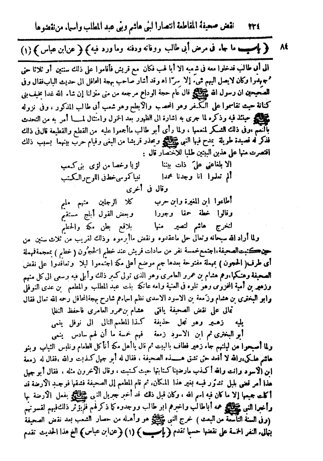 ولما أصبحوا من ليلتهم جاء زهير فطاف بالبيت ثم قال يا أهل مكة أنأكل الطعام ونلبس الثياب وبنو هاشم هلكى، والله لا أقعد حتى تشق هذه الصحيفة، فقال له أبو جهل كذبت والله، فقال له زمعة ابن الأسود وانت والله أكذب ما رضينا كتابتها حيث كتبت، وقال الآخرون مثله، فقال أبو جهل هذا أمر قضى بليل تشوّر فيه بغير هذا المكان، ثم قام المطعم إلى الصحيفة فشقها فوجد الأرضة قد أكلت جميعها إلا ما كان فيه اسم الله، وكان قبل ذلك قد أخبر جبريل النبى صلى الله عليه وسلم بفعل الأرضة بها وأخبر النبى صلى الله عليه وسلم عمه أبا طالب واخبرهم ابو طالب ووجدوه كما ذكر لهم فلم يؤثر ذلك فيهم لقسوتهم (وفى السنة التاسعة من البعث) خرج النبى صلى الله عليه وسلم هو وأهله من حصار الشعب بعد نقض الصحيفة بتهالئ النفر الخمسة على نقضها حسبما تقدم (باب) (1) (عن ابن عباس) الخ هذا الحديث تقدم