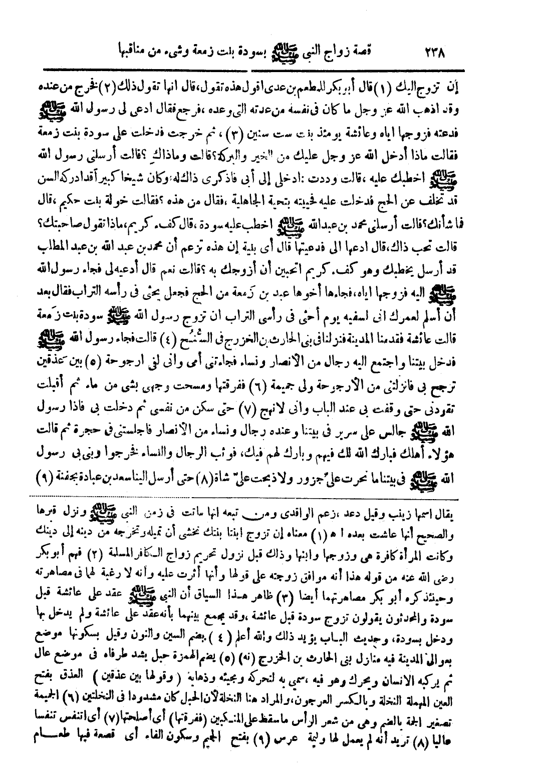 يقال اسمها زينب وقيل دعد، زعم الواقدى ومن تبعه انها ماتت فى زمن النبى صلى الله عليه وسلم ونزل قبرها والصحيح أنها عاشت بعده اهـ (1) معناه إن تزوج ابننا بنتك نخشى أن تميله وتخرجه من دينه إلى دينك وكانت المرأة كافرة هى وزوجها وابنها وذلك قبل نزول تحريم زواج الكافر المسلمة (2) فهم أبو بكر رضي الله عنه من قوله هذا أنه موافق زوجته على قولها وأنها أثرت عليه وأنه لا رغبة لهما فى مصاهرته وحينئذ كره أبو بكر مصاهرتهما أيضا (3) ظاهر هذا السياق أن النبى صلى الله عليه وسلم عقد على عائشة قبل سودة والمحدثون يقولون تزوج سودة قبل عائشة، وقد يجمع بينهما بأنه عقد على عائشة ولم يدخل بها ودخل بسودة، وحديث الباب يؤيد ذلك والله أعلم (4) بضم السين والنون وقيل بسكونها موضع بعوالى المدينة فيه منازل بنى الحارث بن الخزرج (نه) (5) يضم الهمزة حبل بشد طرفاه فى موضع عال ثم يركبه الانسان ويحرك وهو فيه، سمي به لتحركه ومجيئه وذهابه (وقولها بين عذقين) العذق بفتح العين المهملة النخلة وبالكسر العرجون، والمراد هنا النخلة لأن الحبل كان مشدودا فى النخلتين (6) الجميمة تصغير الجمة بالضم وهى من شعر الرأس ما سقط على المنكبين (ففرقتها) أى أصلحتها (7) أى اتنفس تنفسا عاليا (8) تريد أنه لم يعمل لها وليمة عرس (9) بفتح الجيم وسكون الفاء أي قصعة فيها طعام