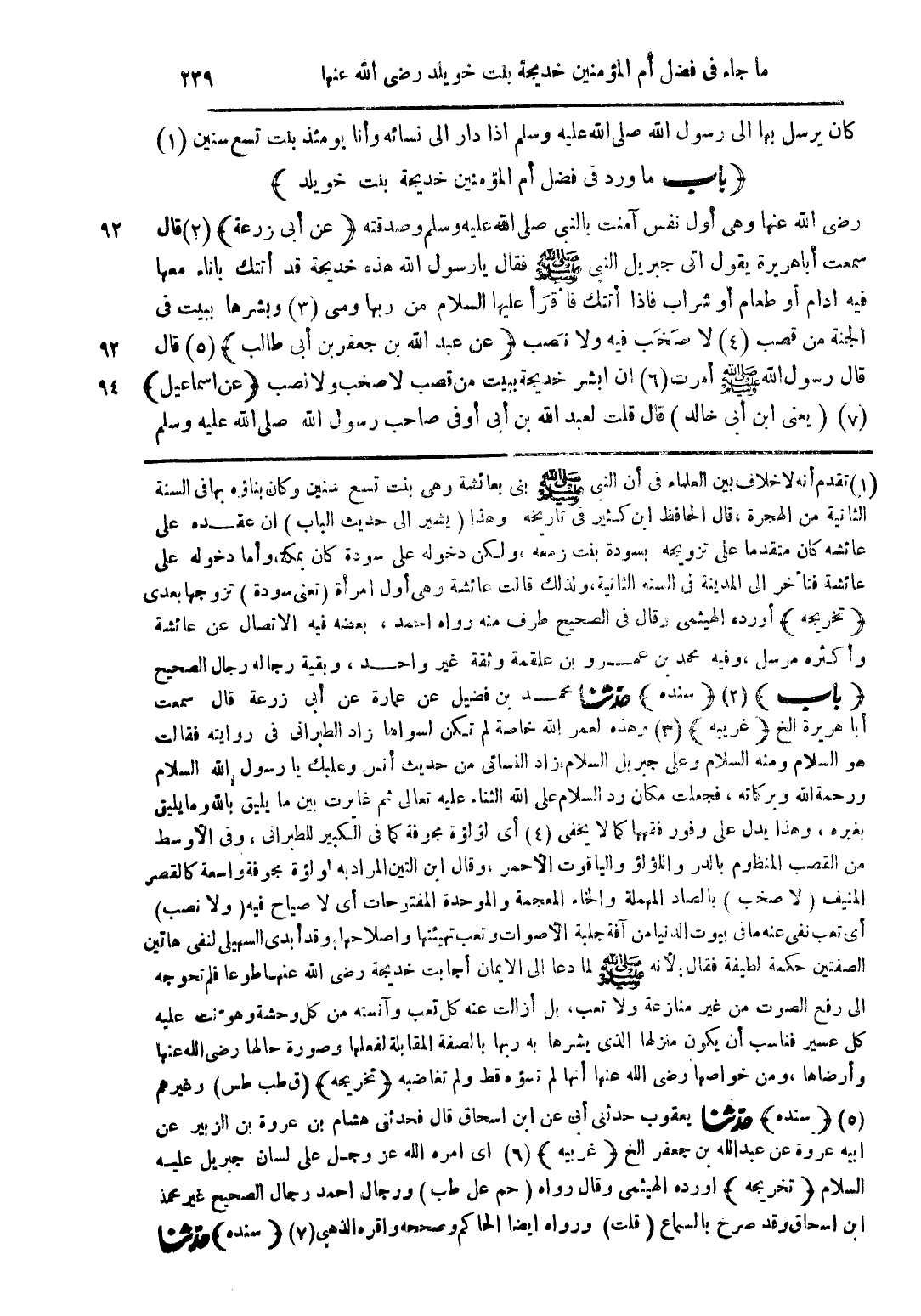 (1) تقدم أنه لا خلاف بين العلماء فى أن النبى صلى الله عليه وسلم بنى بعائشة وهى بنت تسع سنين وكان بناؤه بها فى السنة الثانية من الهجرة، قال الحافظ ابن كثير فى تاريخه وهذا (يشير الى حديث الباب) ان عقده على عائشه كان متقدما على تزويجه بسودة بنت زمعه، ولكن دخوله على سودة كان بمكة وأنا دخوله على عائشة فتأخر الى المدينة فى السنة الثانية، ولذلك قالت عائشة وهى أول امرأة (تعنى سودة) تزوجها بعدى (تخريجه) أورده الهيثمى وقال فى الصحيح طرف منه رواه احمد، بعضه فيه الاتصال عن عائشة وأكثره مرسل، وفيه محمد بن عمرو بن علقمة وثقة غير واحد، وبقية رجاله رجال الصحيح (باب) (2) (سنده) حدّثنا محمد بن فضيل عن عمارة عن أبى زرعة قال سمعت أبا هريرة الخ (غريبه) (3) وهذه لعمر الله خاصة لم تكن لسواها زاد الطبرانى فى روايته فقالت هو السلام ومنه السلام وعلى جبريل السلام، زاد النسائى من حديث أنس وعليك يا رسول الله السلام ورحمة الله وبركاته، فجعلت مكان رد السلام على الله الثناء عليه تعالى ثم غايرت بين ما يليق بالله وما يليق بغيره، وهذا يدل على وفور فقهها كما لا يخفى (4) أى لؤلؤة مجوفة كما فى الكبير للطبرانى، وفى الأوسط من القصب المنظوم بالدر واللؤلؤ والياقوت الأحمر، وقال ابن التين المراد به لؤلؤة مجوفة واسعة كالقصر المنيف (لا صخب) بالصاد المهملة والخاء المعجمة والموحدة المفتوحات أى لا صياح فيه (ولا نصب) أى تعب نفى عنه ما فى بيوت الدنيا من آفة جلبة الأصوات وتعب تهيئتها واصلاحها: وقد أبدى السهيلى لنفى هاتين الصفتين حكمة لطيفة فقال: لأنه صلى الله عليه وسلم لما دعا الى الايمان أجابت خديجة رضي الله عنها طوعا فلم تحوجه الى رفع الصوت من غير منازعة ولا تعب، بل أزالت عنه كل تعب وآنسته من كل وحشة وهوّنت عليه كل عسير فناسب أن يكون منزلها الذى بشرها به ربها بالصفة المقابلة لفعلها وصورة حالها رضي الله عنها وأرضاها، ومن هواصها رضي الله عنها أنها لم تسؤه قط ولم تغاضبه (تخريجه) (ق طب طس) وغيرهم (5) (سنده) حدّثنا يعقوب حدثنى أبى عن ابن اسحاق قال فحدثنى هشام بن عروة بن الزبير عن ابيه عروة عبد الله بن جعفر الخ (غريبه) (6) اى امره الله عز وجل على لسان جبريل عليه السلام (تخريجه) اورده الهيثمى وقال رواه (حم عل طب) ورجال احمد رجال الصحيح غير محمد ابن اسحاق وقد صرح بالسماع (قلت) ورواه ايضا الحاكم وصححه واقره الذهبى (7) (سنده) حدّثنا