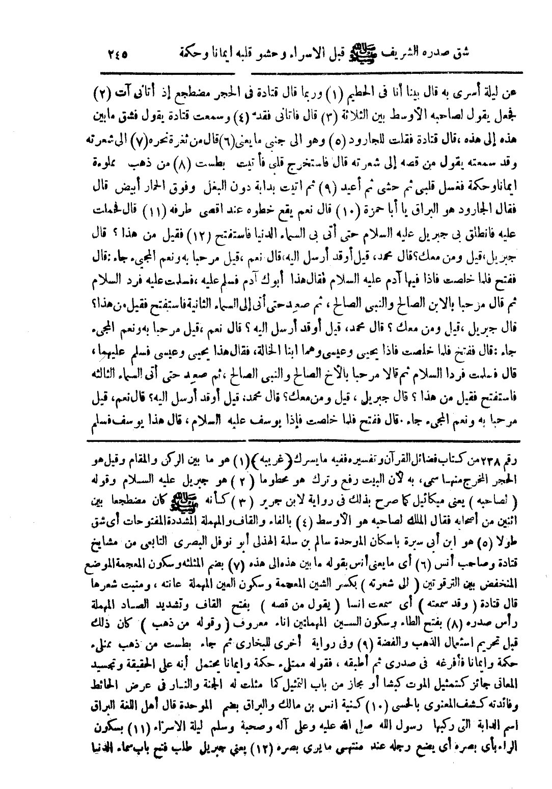 رقم 238 من كتاب فضائل القرآن وتفسير ففيه ما يسرك (غريبه) (1) هو ما بين الركن والمقام وقيل هو الحجر المخرج منها سمى، به لأن البيت رفع وترك هو محطوما (2) هو جبريل عليه السلام وقوله (لصاحبه) يعنى ميكائيل كما صرح بذلك فى رواية لابن جرير (3) كأنه صلى الله عليه وسلم كان مضطجعا بين اثنين من أصحابه فقال الملك لصاحبه هو الأوسط (4) بالفاء والقاف والمهملة المشددة المفتوحات أى شق طولا (5) هو ابن أبى سيرة باسكان الموحدة سالم بن سلمة الهذلى أبو نوفل البصرى التابعى من مشايخ قتادة وصاحب أنس (6) أى ما يعنى أنس بقوله ما بين هذه الى هذه (7) بضم المثلثه وسكون المعجمة الموضع المنخفض بين الترقوتين (الى شعرته) بكسر الشين المعجمة وسكون العين المهملة عانته، ومنبت شعرها قال قتادة (وقد سمعته) أى سمعت انسا (يقول من قصه) بفتح القاف وتشديد الصاد المهملة رأس صدره (8) بفتح الطاء وسكون السين المهملتين اناء معروف (وقوله من ذهب) كان ذلك قبل تحريم استعمال الذهب والفضة (9) وفى رواية أخرى للبخارى ثم جاء بطست من ذهب ممتلئ حكمة وايمانا فأفرغه فى صدرى ثم أطبقه، فقوله ممتلئ حكمة وايمانا يحتمل أنه على الحقيقة وتجسيد المعانى جائز كتمثيل الموت كبشا أو مجاز من باب التمثيل كما مثلت له الجنة والنار فى عرض الحائط وفائدته كشف المعنوى بالحسى (10) كنية انس بن مالك والبراق بضم الموحدة قال أهل اللغة البراق اسم الدابة التى ركبها رسول الله صلى الله عليه وعلى آله وصحبه وسلم ليلة الاسراء (11) بسكون الراء بأى بصره رجله عند منتهى ما يرى بصره (12) يعنى جبريل طلب فتح باب سماء الدنيا