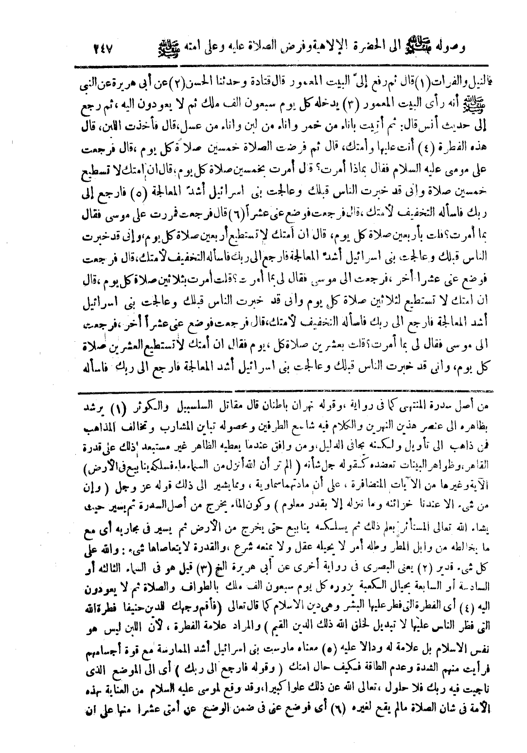 من أصل سدرة المنتهى كما فى رواية، وقوله نهران باطنان قال مقاتل السلسبيل والكوثر (1) يرشد بظاهره الى عنصر هذين النهرين والكلام فيه شاسع الطرفين ومحصوله تباين المشارب وتخالف المذاهب فمن ذاهب الى تأويل ولكنه يجافى الدليل، ومن وافق عندما يعطيه الظاهر غير مستبعد ذلك على قدرة القاهر، وظواهر البينات تعضده كقوله جل شأنه {الم تر أن الله أنزل من السماء ماء فسلكه ينابيع فى الأرض} الآية وغيرها من الآيات المتضافرة، على أن مادتهما سماوية، ومما يشير الى ذلك قوله عز وجل {وإن من شئ الا عندنا خزائنه وما ننزله إلا بقدر معلوم} وكون الماء يخرج من أصل السدرة ثم يسير حيث يشاء الله تعالى المستأثر بعلم ذلك ثم يسلكه ينابيع حتى يخرج من الأرض ثم يسير فى مجاريه أى مع ما يخالطه من وابل المطر وطله أمر لا يحيله عقل ولا يمنعه شرع، والقدرة لا يتعاصاها شئ: والله على كل شئ قدير (2) يعنى البصرى فى رواية أخرى عن أبى هريرة الخ (3) قيل هو فى السماء الثالثة أو السادسة أو السابعة بحبال الكعبة يزوره كل يوم سبعون الف ملك بالطواف والصلاة ثم لا يعودون اليه (4) أى الفطرة التى فطر عليها البشر وهى دين الاسلام كما قال تعالى {فأقم وجهك للدين حنيفا فطرة الله التى فطر الناس عليها لا تبديل لخلق الله ذلك الدين القيم} والمراد علامة الفطرة، لأن اللبن ليس هو نفس الاسلام بل علامة له ودالا عليه (5) معناه مارست بنى اسرائيل أشد الممارسة مع قوة أجسامهم فرأيت منهم الشدة وعدم الطاقة فكيف حال امتك (وقوله فارجع الى ربك) أى الى الموضع الذى ناجيت فيه ربك فلا حلول، تعالى الله عن ذلك علوا كبيرا، وقد وقع لموسى عليه السلام من العناية بهذه الأمة فى شان الصلاة ما لم يقع لغيره (6) أى فوضع عنى فى ضمن الوضع عن أمتى عشرا منها على أن