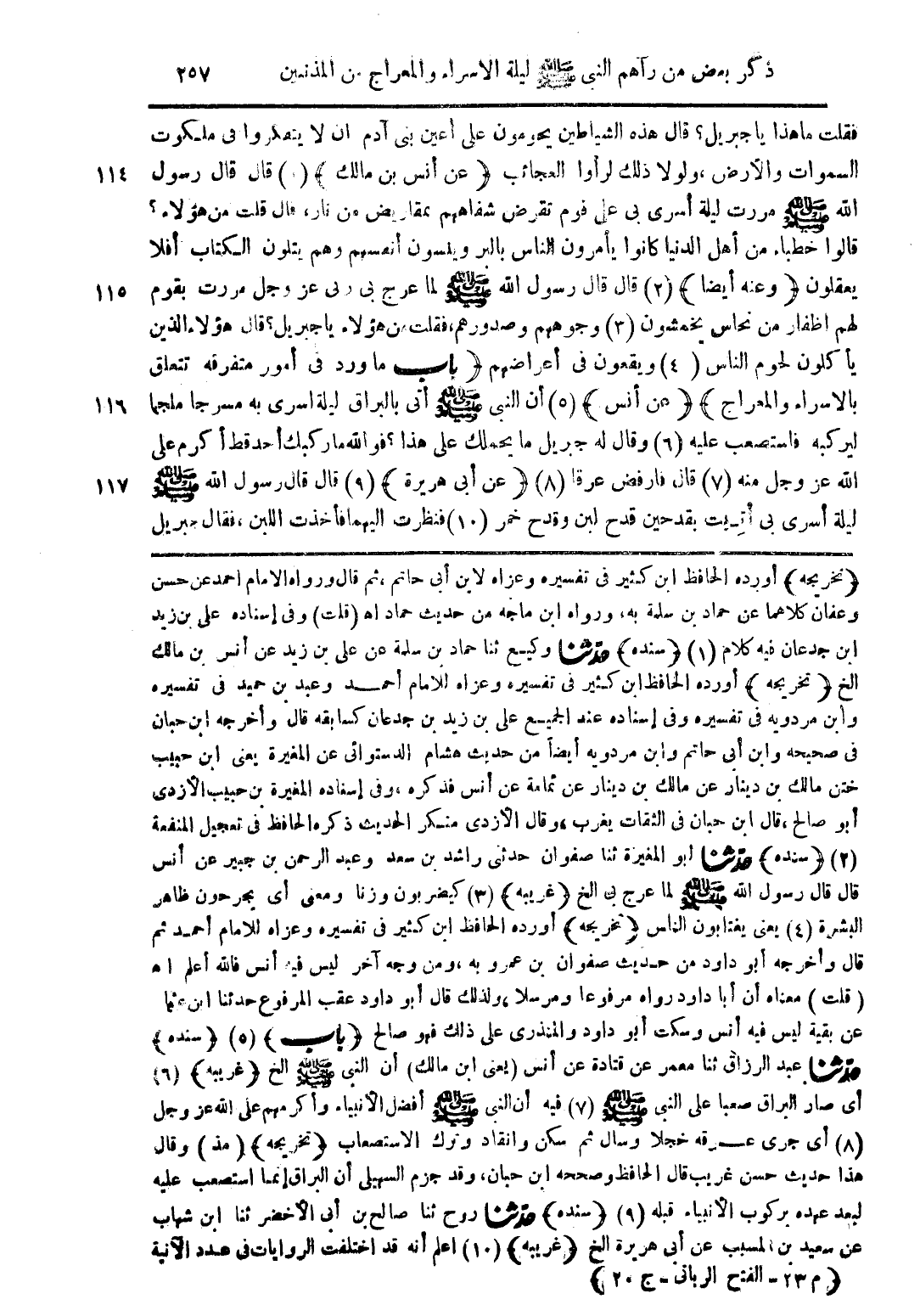 (تخريجه) أورده الحافظ ابن كثير فى تفسيره وعزاه لابن أبى خاتم، ثم قال ورواه الامام احمد عن حسن وعفان كلاهما عن حماد بن سلمة به، ورواه ابن ماجه من حديث حماد اهـ (قلت) وفى إسناده على بن زيد ابن جدعان فيه كلام (1) (سنده) حدّثنا وكيع ثنا حماد بن سلمة عن على بن زيد عن أنس بن مالك الخ (تخريجه) أورده الحافظ ابن كثير فى تفسيره وعزاه للامام أحمد وعبد بن حميد فى تفسيره وابن مردويه فى تفسيره وفى إسناده عند الجميع على بن زيد بن جدعان كسابقه قال وأخرجه ابن حبان فى صحيحه وابن أبى حاتم وابن مردويه أيضًا من حديث هشام الدستوائى عن المغيرة يعنى ابن حبيب ختن مالك بن دينار عن مالك بن دينار عن ثمامة عن أنس فذكره، وفى إسناده المغيرة بن حبيب الأزدى أبو صالح، قال ابن حبان فى الثقات يغرب، وقال الأزدى منكر الحديث ذكره الحافظ فى تعجيل المنفعة (2) (سنده) حدّثنا أبو المغيرة ثنا صفوان حدثنى راشد بن سعد وعبد الرحمن بن جبير عن أنس قا قال رسول الله صلى الله عليه وسلم لما عرج بى الخ (غريبه) (3) كشربون وزنا ومعنى أى يجرحون ظاهر البشرة (4) يعنى يغتابون الناس (تخريجه) أورده الحافظ ابن كثير فى تفسيره وعزاه للامام أحمد ثم قال وأخرجه أبو داود من حديث صفوان بن عمرو به، ومن وجه آخر ليس فيه أنس فالله أعلم اهـ (قلت) معناه أن أبا داود رواه مرفوعا ومرسلا، ولذلك قال أبو داود عقب المرفوع حدثنا ابن عثمان عن بقية ليس فيه أنس وسكت أبو داود والمنذرى على ذلك فهو صالح (باب) (5) (سنده) حدّثنا عبد الرازق ثنا معمر عن قتادة عن أنس (يعنى ابن مالك أن النبى صلى الله عليه وسلم الخ (غريبه) (6)) أى صار البراق صعبا على النبى صلى الله عليه وسلم (7) فيه أن النبى صلى الله عليه وسلم أفضل الأنبياء وأكرمهم على الله عز وجل (8) أى جرى عرقهخجلا وسال ثم سكن وانقاد وترك الاستصعاب (تخريجه) (مذ) وقال هذا حديث حسن غريب قال الحافظ وصححه ابن حبان، وقد جزم السهيلى أن البراق إنما استصعب عليه لبعد عهده بركوب الأنبياء قبله (9) (سنده) حدّثنا روح ثنا صالح بن أبى الأخضر ثنا ابن شهاب عن سعيد بن المسيب عن أبى هريرة الخ (غريبه) (10) اعلم أنه قد اختلفت الروايات في عدد الآنية