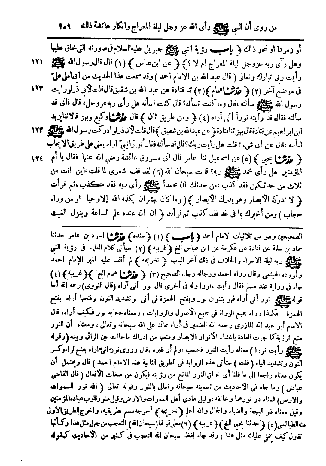 الصحيحين وهو من ثلاثيات الامام أحمد (باب) (1) (سنده) حدّثنا اسود بن عامر حدثنا حماد بن سلمة عن قتادة عن عكرمة عن ابن عباس الخ (غريبه) (2) سيأتى كلام العلماء فى رؤية النبى صلى الله عليه وسلم ربه ليلة الاسراء والخلاف فى ذلك آخر الباب (تخريجه) لم أقف عليه لغير الإمام احمد وأورده الهيثمى وقال رواه احمد ورجاله رجال الصحيح (3) (حدّثنا همام الخ) (غريبه) (4) جاء فى رواية عند مسلم فقال رأيت، نورا وله فى أخرى قال نور أنى آراه (قال النووى) رحمه الله أما قوله صلى الله عليه وسلم نور أنى أراه فهو بتنوين نور وبفتح الهمزة فى أنى وتشديد النون وفتحها أراه بفتح الهمزة هكذا رواه جميع الرواة فى جميع الأصول والروايات، ومعناه حجابه نور فكيف أراه، قال الامام أبو عبد الله المازرى رحمه الله الضمير فى أراه عائد على الله سبحانه وتعالى، ومعناه أن النور منع الرؤية كما جرت العادة باغشاء الأنوار الابصار ومنعها من ادراك ماحالت بين الرائي وبينه (وقوله صلى الله عليه وسلم رأيت نورا) معناه رأيت النور فسحب، ولم أر غيره، قال وروى نورانىّ اراه بفتح الراء وكسر النون وتشديد الياء (قلت) ستأتى هذه الرواية فى الطريق الثانية عند الامام احمد) قال ويحتمل أن يكون معناه رجاعا الى ما قلنا أى خالق النور المانع من رؤيته فيكون من صفات الأفعال (قال القاضى عياض) وما جاء فى الأحاديث من تسميته سبحانه وتعالى بالنور وقوله تعالى {الله نور السموات والارض} فمعناه ذو نورهما وخالقه، وقيل هادى أهل السموات والارض وقيل منور قلوب عباده المؤمنين وقيل معناه ذو البهجة والضياء والجمال والله أعلم (تخريجه) أخرجه مسلم بطريقيه، واخرج الطريق الاولى منه الطيالسى (5) (حدثنا يحيى الخ) (غريبه) (6) معنى قولها (سبحان الله) التعجب من جهل مثل هذا وكأنها تقول كيف يخفى عليك مثل هذا: وقد جاء لفظ سبحان الله للتعجب فى كثير من الأحاديث كقوله