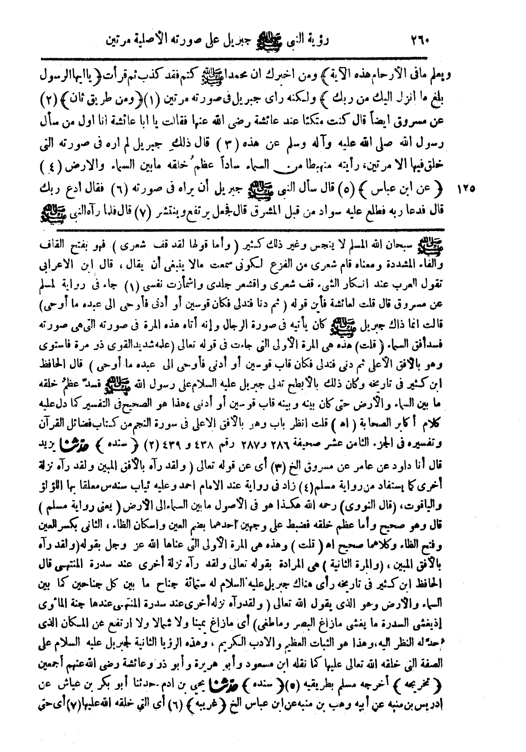 ويعلم ما في الأرحام هذه الآية} ومن اخبرك ان محمدًا صلى الله عليه وسلم كتم فقد كذب ثم قرأت {يا ابها الرسول بلغ ما أنزل اليك من ربك} ولكنه راى جبريل فى صورته مرتين (ومن طريق ثان) عن مسروق ايضًا قال كنت متكئا عند عائشة رضي الله عنها فقالت يا أبا عائشة أنا اول من سأل رسول الله صلى الله عليه وآله وسلم عن هذه قال ذلك جبريل لم اره فى صورته التى خلق الا مرتين، رأيته منهبطا من السماء سادًا عظم خلقه ما بين السماء والارض (عن ابن عباس) قال سأل النبى صلى الله عليه وسلم جبريل أن يراه فى صورته فقال ادع ربك قال فدعا ربه فطلع عليه سواد من قبل المشرق قال فجعل يرتفع وينتشر قال فلما رآه النبي صلى الله عليه وسلم