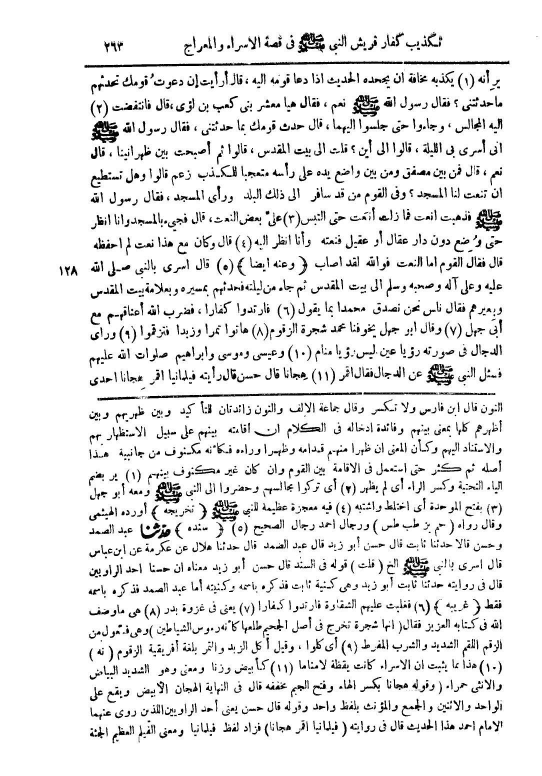 النون قال ابن فارس ولا تكسر وقال جماعة الالف والنون زائدتان التأكد وبين ظهريهم وبين أظهرهم كلها بمعنى بينهم وفائدة إدخاله فى الكلام أن اقامته بينهم على سبيل الاستظهار بهم والاستناد اليهم وكأن المعنى ان ظهرا منهم قدامه وظهرا وراءه فكأنه مكنوف من جانبية هذا أصله ثم كثر حتى استعمل فى الاقامة بين القوم وان كان غير مكنوف بينهم (?) ير بضم الياء التحتية وكسر الراء أى لم يظهر (2) أى تركوا مجالسهم وحضروا الى النبى صلى الله عليه وسلم ومعه أبو جهل (?) بفتح الموحدة أى اختلط واشتبه (4) فيه معجزة عظيمة النبى صلى الله عليه وسلم (تخريجه) أورده الهيثمى وقال رواه (حم بز طب طس) ورجال أحمد رجال الصحيح (5) (سنده) حدّثنا عبد الصمد وحسن قالا حدثنا ثابت قال حسن أبو زيد قال عبد الصمد قال حدثنا هلال عن عكرمة عن ابن عباس قال اسرى بالنبى صلى الله عليه وسلم الخ (قلت) قوله فى السند قال حسن أبو زيد معناه ان حسنا أحد الراويين قال فى روايته حدثنا ثابت أبو زيد وهى كنية ثابت فذكره باسمه وكنيته أما عبد الصمد فذكره باسمه فقط (غريبه) (6) فغلبت عليهم الشقاوة فارتدوا كفارا (7) يعنى فى غزوة بدر (8) هى ما وصف الله فى كتابه العزيز فقال {انها شجرة تخرج فى أصل الجحيم طلعهاكأنه رءوس الشياطين} وهى فتعول من الرقم اللقم الشديد والشرب المفرط (9) أى كلوا، وقيل أكل الزبد والتمر بلغة أفريقية الزقوم (نه) (10) هذا مما يثبت أن الاسراء كانت يقظة لامناما (11) كأبيض وزنا ومعنى وهو الشديد البياض والانثى حمراء (وقوله هجانا كسر الهاء وفتح الجيم مخففه قال فى النهاية الهجان الأبيض ويقع على الواحد والاثنين والجمع والمؤنث بلفظ واحد وقوله قال حسن يعنى أحد الراويين اللذان روى عنهما الامام حمد هذا الحديث قال فى روايته (فيلمانيا اقمر هجانا) فزاد لفظ فيلمانيا ومعنى الفيلم العظيم الجثة