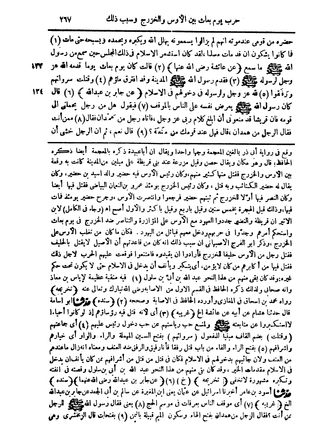 وقع في رواية أبى ذر بالغين المعجمة وجها واحدا ويقال ان أبا عبيدة ذكره بالمعجمة أيضا ذكره الحافظ، قال وهو مكان ويقال حصن وقيل مزرعة عند بنى قريظة على ميلين من المدينة كانت به وقعة بين الأوس والخزرج فقتل منها كثير منهم، وكان رئيس الأوس فيه حضير والد اسيد بن حضير، وكان يقال له حضير الكتائب وبه قتل، وكان رئيس الخزرج يومئذ عمرو بن النعمان البياضى فقتل فيها أيضا وكان النصر فيها أو لا الخزرج ثم ثبتهم حضير فرجعوا وانتصرت الأوس، وجرح حضير يومئذ فات فيها، وذلك قبل الهجرة بخمس سنين وقيل باربع وقيل باكثر والأول أصح اهـ (وجاء فى الكامل) لابن الاثير ان قريظة والنضير جددوا العهود مع الأوس على المؤازرة والتناصر ضد الخزرج فى يوم بعاث واستحك أمرهم وجدّوا فى حربهم ودخل معهم قبائل من اليهود. فكان ما كان من تغلب الأوس على الخزرج، وذكر ابو الفرج الأصبهانى ان سبب ذلك انه كان من قاعدتهم أن الأصيل لا يقتل بالحليف فقتل رجل من الأوس حليفا الخزرج فأرادو اان يقيدوه فامتنعوا فوقعت عليهم الحرب لاجل ذلك فقتل فيها من أكابرهم من كان لا يؤمن، أى يتكبر ويأنف أن يدخل فى الاسلام حتى لا يكون تحت حكم غيره: وقد كان بقى منهم من هذا النحو عبد الله بن أبىّ بن سلول (1) فيه منقبة عظيمة لإياس بن معاذ وانه صحابى ولذلك ذكر هـ الحافظ فى القسم الاول من الاصابه رضى الله تبارك وتعالى عنه (تخريجه) رواه محمد بن اسحاق فى المغازى وأورده الحافظ فى الاصابة وصححه (2) (سنده) حدّثنا أبو أسامة قال حدثنا هشام عن أبيه عن عائشة الخ (غريبه) (3) أى لأنه قتل فيه رؤساؤهم إذ لو كانوا أحياءا لاستكبروا عن متابعته صلى الله عليه وسلم ولمنع حبب رياستهم عن حب دخول رئيس عليهم (4) أى جماعتهم (وقتلت) بضم القاف مبنيا للمفعول (سروائهم) بفتح السين المهملة والراء. والواو أى خيارهم واشرافهم (5) بفتح الراء والفاء من باب قتل رفقا فأنا رفيق والرفق ضد العنف ومعناه انه زال ما عندهم من العنف ولان جانبهم بدخولهم فى الاسلام فكان فى قتل من قتل من أشرافهم ممن كان يأنف ان يدخل فى الاسلام مقدمات الخير، وقد كان بقى منهم من هذا النحو عبد الله بن أبى بن سلول وقصته فى انفته وتكبره مشهورة لا تخفى (تخريجه) (خ) (6) (عن جابر بن عبد الله رضى الله عنهما) (سنده) حدّثنا أسود بن عامر أخبرنا اسرائيل عن عثمان يعنى ابن المغيرة عنا سالم بن أبى الجعد عن جابر بن عبد الله الخ (غريبه) (7) أى موقف الناس بعرفات فى موسم الحج (8) يعنى فقال رسول الله صلى الله عليه وسلم للرجل ممن أنت؟ فقال الرجل من همدان بفتح الهاء وسكون الميم قبيلة باليمن (9) بفتحات قال الزمخشري وهي
