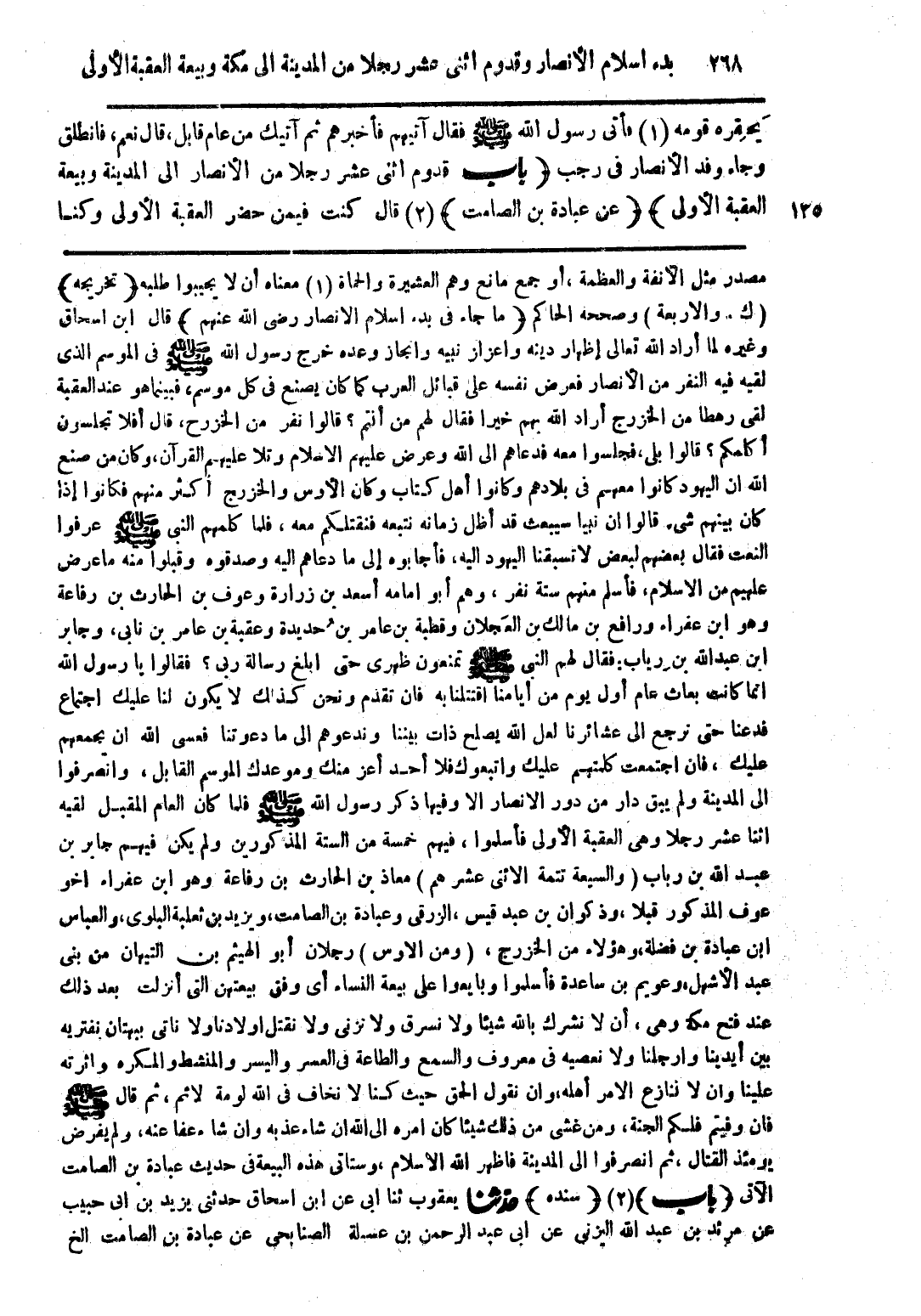 يحقره قومه فاتى رسول الله صلى الله عليه وسلم فقاله آتيهم فأخبرهم ثم آتيك من عام قابل، قال نعم، فانطلق وجاء وفد الأنصار فى رجب (باب قدوم اثنى عشر رجلا من الأنصار الى المدينة وبيعة العقبة الأولى) (عن عبادة بن الصامت) قال كنت فيمن حضر العقبة الأولى وكنا