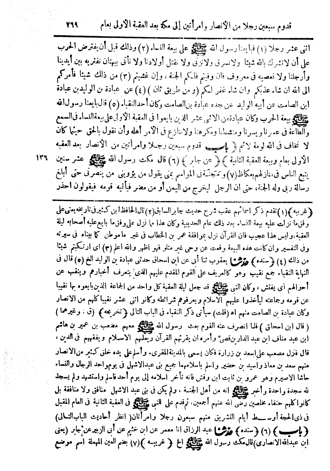 اثني عشر رجلا فبايعنا رسول الله صلى الله عليه وسلم على بيعة النساء وذلك قبل أن يفترض الحرب على أن لا نشرك بالله شيئا ولا نسرق ولا نزنى ولا نقتل أولادنا ولا نأتى ببهتان نفتريه بين أيدينا وأرجلنا ولا نعصيه فى معروف فان وفيتم فلكم الجنة، وإن غشيتم من ذلك شيئا فأمركم الى الله ان شاء عذبكم وان شاء غفر لكم (ومن طري ثان) عن عبادة بن الوليد بن عبادة ابن الصامت عن أبيه الوليد عن جده عبادة بن الصامت وكان أحد النقباء قال بايعنا رسول الله صلى الله عليه وسلم بيعة الحرب وكان عبادة من الاثنى عشر الذين بايعوا فى العقبة الأولى على بيعة النساء فى السمع والطاعة فى عسرنا ويسرنا ومنشطنا ومكرهنا ولا ينازع فى الأمر أهله وأن نقول بالحق حيثما كان لا نخاف فى الله لومة لائم (باب قدوم سبعين رجلا وامرأتين من الأنصار بعد العقبه الأولى بعام وبيعة العقبة الثانية) (عن جابر) قال مكث رسول الله صلى الله عليه وسلم عشر سنين يتبع الناس فى منازلهم بعكاظ ومجنّة فى المواسم بمنى يقول من يؤوينى من ينصرنى حتى أبلغ رسالة ربى وله الجنة، حتى ان الرجل ليخرج من اليمن أو من مضر فيأتيه قومه فيقولون احذر