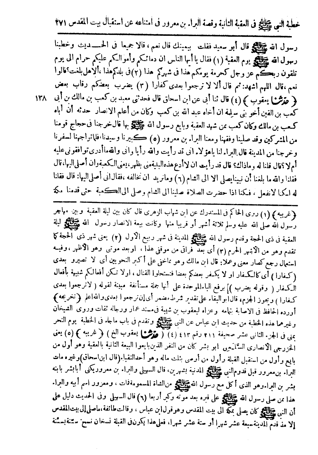 (غريبه) (1) روى الحاك فى المستدرك عن ابن شهاب الزهرى قال كان بين ليلة العقبة وبين مهاجر رسول الله صلى الله عليه وسلم ثلاثة أشهر أو قريبا منها وكانت بيعة الانصار رسول الله صلى الله عليه وسلم ليلة العقبة فى ذى الحجة وقدم رسول الله صلى الله عليه وسلم المدينة فى شهر ربيع الأول (2) يعنى شهر ذى الحجة كما تقدم وهو من الأشهر الحرم (3) أى بعد فراق من موقفى هذا، او بعد موتى وهو الأظهر، وفيه استعمال راجع كصار معنى وعملا: قال ابن مالك وهو مما خفى على أكبر النحويين أى لا تصيرو بعدى (كفارا) أى كالكفار او لا يكفر بعضكم بعضا فتستحلوا القتال، اولا تكن أفعالكم شبيهة بأفعال الكفار (وقوله يضرب)] برفع الباء الموحدة على أنها جملة مستأنفة مبينة لقوله (لا ترجعوا بعدى كفارا) ومجوز الجزم، قال ابو البقاء على تقدير شرط مضمر أى إن ترجعوا بعدى والله اعلم (تخريجه) أورده الحافظ فى الاصابة بتمامه وعزاه ليعقوب بن شيبة فى مسند عمار ورجاله ثقات وروى الشيخان وغيرهما هذه الخطبة من حديث ابن عباس عن النبى صلى الله عليه وسلم وتقدم فى باب ما جاء فى الخطبة يوم النحر بمنى فى الجزء الثانى عشر صحيفة 211 رقم 413 (4) (حدّثنا يعقوب الخ) (غريبه) (5) يعنى الخزرجى الأنصارى السَّلمى ابو بشر كان من النفر الذين بايعوا البيعة الثانية بالعقبة وهو أول من بايع وأول من استقبل القبلة وأول من أوصى بثلث ماله وهو أحد النقباء (قال ابن اسحاق) وغيره مات البراء بن معرور قبل قدوم النبى صلى الله عليه وسلم المدنية بشهرين، قال السهيلى والبراء بن معرور يكنى أبا بشر بابنه بشر بن البراء وهو الذى أكل مع رسول الله صلى الله عليه وسلم من الشاة المسمومة فات، ومعزور اسم أبيه والبراء هذا ممن صلى رسول الله صلى الله عليه وسلم على قبره بعد موته وكبر اربعا (6) قال السهيلى وفى الحديث دليل على أن النبى صلى الله عليه وسلم وكان يصلى بمكة الى بيت المقدس وهو قول ابن عباس، وقا لت طائفة، ما صلى إلى بيت المقدس إلا مذ قدم المدينة سبعة عشر شهرا أو ستة عشر شهرا، فعلى هذا يكون فى القبلة نسخان نسخ سنّة بسنة