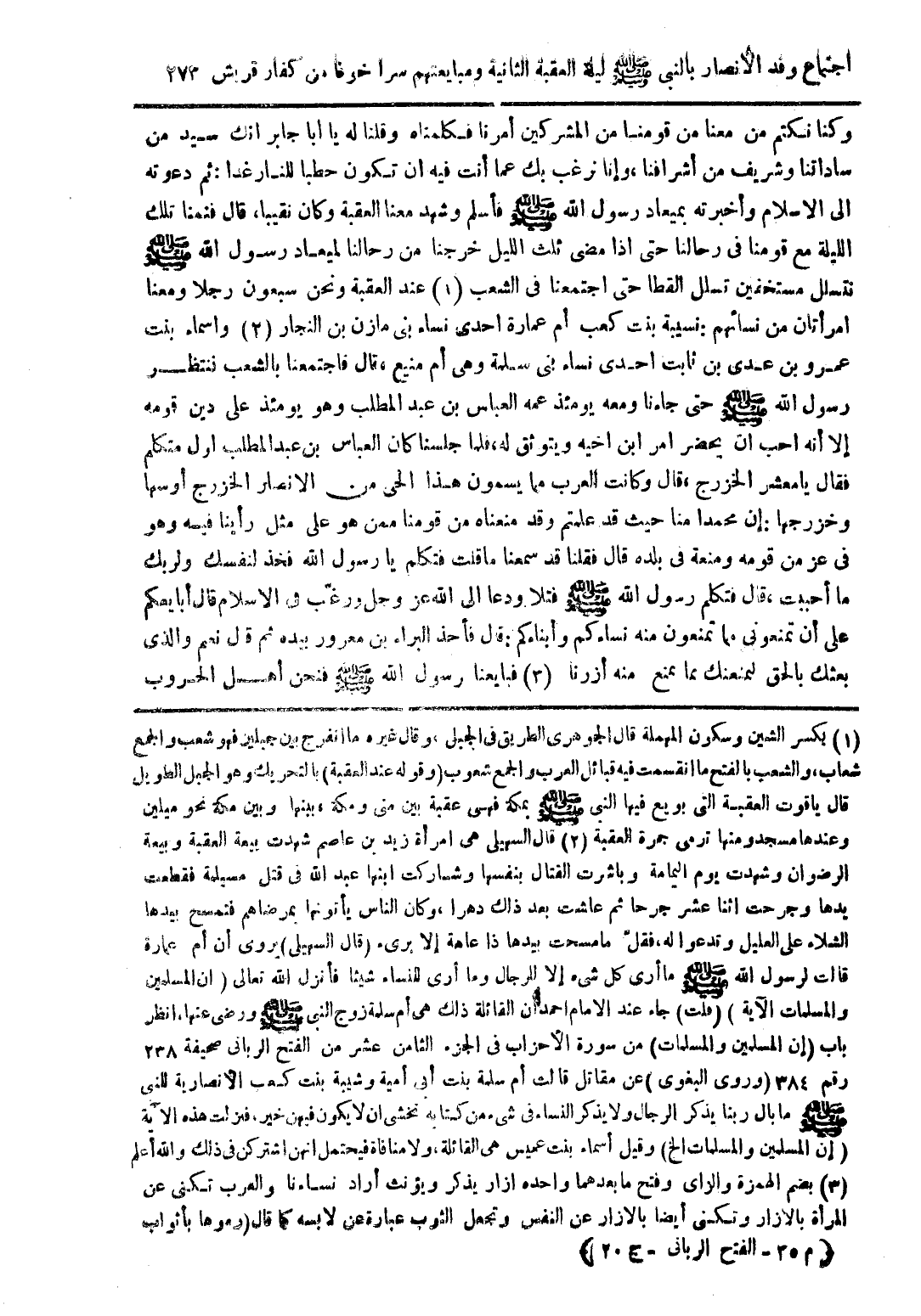 (1) بكسر الشين وسكرن المهملة قال الجوهرى الطريق فى الجبل، وقال غيره ما انفرج بن جبلين فهو شعب والجمع شعاب، والشعب بالفتح ما انقسمت فيه قبائل العرب والجمع شعوب (وقوله عند العقبة) بالتحريك وهو الجبل الطويل قال ياقوت العقبة التى بويع فيها النبى صلى الله عليه وسلم بمكة فهى عقبة بين منى ومكة، بينها وبين مكة نحو ميلين وعندها مسجد ومنها ترمى جمرة العقبة (2) قال السهيلى هى امرأة زيد بن عاصم شهدت بيعة العقبة وبيعة الرضوان وشهدت يوم اليمامة وباشرت القتال بنفسها وشاركت ابنها عبد الله فى قتل مسيلة فقطعت يدها وجرحت اثنا عشر جرحا ثم عاشت بعد ذلك دهرا، وكان الناس يأتونها بمرضاهم فتمسح بيدها الشلاء على العليل وتدعوا له، فقل ما مسحت بيدها ذا عاهة إلا برئ (قال السهيلى) يروى أن أم عمارة قالت لرسول الله صلى الله عليه وسلم ما أرى كل شئ إلا للرجال وما أرى للنساء شيئا فأنزل الله تعالى {ان المسلمين والمسلمات الآية} (قلت) جاء عند الامام احمد ان القائلة ذلك هى أم سلمة زوج النبى صلى الله عليه وسلم ورضى عنها، انظر باب (إن المسلين والمسلمات) من سورة الأحزاب فى الجزء الثامن عشر من الفتح الربانى صحيفة 238 رقم 384 (وروى البغوى) عن مقاتل قالت أم سلمة بنت أبى أمية وشيبة بنت كعب الأنصارية للنبى صلى الله عليه وسلم ما بال ربنا يذكر الرجال ولا يذكر النساء فى شئ من كتابه تخشى ان لا يكون فيهن خير، فنزلت هذه الآية (إن المسلمين والمسلمات الخ) وقيل أسماء بنت عميس هى القائلة، ولا منافاة فيحتمل انهن اشتركن فى ذلك والله أعلم (3) بضم الهمزة والزاى وفتح ما بعدهما واحده ازار يذكر ويؤنث أراد نساءنا والعرب تكنى عن المرأة بالإزار وتكنى أيضا بالازار عن النفس وتجعل الثوب عبارة عن لابسه كما قال (رموها بأثواب