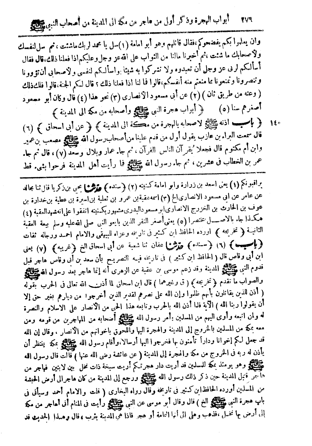 (باب اذنه صلى الله عليه وسلم لاصحابه بالهجرة من مكة الى المدينة) (عن أبى اسحاق) قال سمعت البراء بن عازب يقول أول من قدم علينا من أصحاب رسول الله صلى الله عليه وسلم مصعب بن عمير وابن أم مكتوم قال فجعلا يقرآن الناس القرآن، ثم جاء عمار وبلال وسعد، قال ثم جاء عمر بن الخطاب فى عشرين، ثم جاء رسول الله صلى الله عليه وسلم فما رأيت أهل المدينة فرحوا بشيء قط