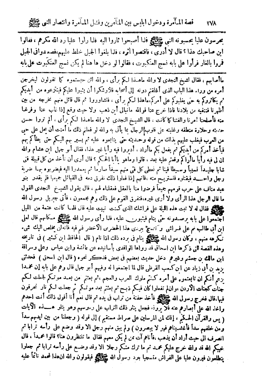 ما أصابهم، فقال لشيخ النجدى لا والله ما هذا لكم برأى، والله لئن حبستموه كما تقولون ليخرجن أمره من وراء هذا الباب الذى أغلقتم دونه إلى أصحابه فلأوشكوا أن يثبوا عليك فينتزعوه من أيديكم ثم يكاثروكم به حتى يغلبوكم على أمركم، ما هذا لكم برأى، فتشاوروا ثم قال قائل منهم نخرجه من بين أظهرنا فن فيه من بلادنا فاذا خرج عنا فوالله ما نبالى أين ذهب ولا حيث وقع إذا غاب عنا وفرغوا منه فأصلحنا أمرنا والفتنا كما كانت، قال الشيخ النجدى لا والله ما هذا لكم برأى، ألم تروا حسن حديثه وحلاوة منطقه وغلبته على قلوب الرجال بما يأتى به والله لو فعلتم ذلك ما أمنت أن يحل على حي من العرب فيغلب عليهم بذلك من قوله وحديثه حتى يتابعوه عليه ثم يسير بهم اليكم حتى يطأكم بهم فيأخذ أمركم من أيديكم ثم يفعل بكم ما أراد، أديروا فيه رأيا غير هذا، فقال أبو جهل ابن هشام والله أن لى فيه رأيًا ما أراكم وقعتم عليه بعد، قالوا وما هو يا أبا الحكم؟ قال أرى أن نأخذ من كل قبيلة فتى شابا جليدًا نسيبًا وسيطا فينا ثم نعطى كل فتى منهم سيفًا صارما ثم يعمدوا اليه فيضربوه بها ضربة رجل واحد سدد فيقتلوه فنستريح منه، فانهم إذا فعلوا ذلك تفرق دمه فى القبائل جميعها فلم يقدر بنو عبد مناف على حرب قومهم جميعًا فرضوا منا بالعقل فعقلناه لهم، قال يقول الشيخ النجدى القول ما قال الرجل هذا الرأى ولا أرى غيره، فتفرق القوم على ذلك وهم يجمعون، فأتى جبر بل رسول الله صلى الله عليه وسلم فقال له لا تبت هذه الليلة على فراشك الذى كانت تبيت عليه قال فلما كانت عتمة من الليل اجتمعوا على بابه يرصدونه حتى ينام فيثبورن عليه، فلما رأى رسول الله صلى الله عليه وسلم مكانهم قال لعلى ابن أبى طالب نم على فراشى وتسج ببردى هذا الحضرمى الأخضر فم فيه فانه لن يخلص اليك شئ تكرهه منهم، وكان رسول الله صلى الله عليه وسلم ينام فى برده ذلك اذا نام (قال الحافظ ابن كثير) فى تاريخه وهذه القصة التى ذكرها ابن اسحاق قد رواها الوافدى بأسانيده عن عائشة وابن عباس وعلى وسراقة ابن مالك بن جعشم وغيرهم دخل حديث بعضهم فى بعض فذكر نحوه (قال ابن اسحق) فحدثنى يزيد بن أبى زياد عن ابن كعب القرظى قال لما اجتمعوا له وفيهم أبو جهل قال وهم على بابه إن محمدا يزعم أنكم تابعتموه على أمره كنتم ملوك العرب والعجم، ثم بعثتم من بعد موتكم فجعلت لكم جنات كجنات الأردن، وان لم تفعلوا كان فيكم ذبح ثم بعثتم بعد موتكم ثم جعلت لكم نار تحرقون فيها، قال فخرج رسولى الله صلى الله عليه وسلم فأخذ حفنة من تراب فى يده ثم قال نعم أنا أقول ذلك أنت احدهم واخذ الله على أبصارهم عنه فلا يرونه فجعل ينثر ذلك التراب على رءوسهم وهو يتلو هذه الآيات {يس والقرآن الحكيم، إنك لمن المرسلين على صراط مستقيم} إلى قوله {وجعلنا من بين أيديهم سدًا ومن خلفهم سدًا فاغشيناهم فهو لا يبصرون} ولم يبق منهم رجل الا وقد وضع على رأسه ترابا ثم انصرف الى حيث أراد أن يذهب، فأتاهم آت ممن لم يكن معهم فقال ما تنتظرون هنا؟ قالوا محمدًا، قال خيبكم الله قد والله خرج عليكم محمد ثم ما نزل منكم رجلا الا وقد وضع على رأسه ترابا ثم جعلوا يتطلعون فيرون عليا على الفراش متسجيا ببرد رسول الله صلى الله عليه وسلم فيقولون والله ان هذا لمحمد نائمًا عليه