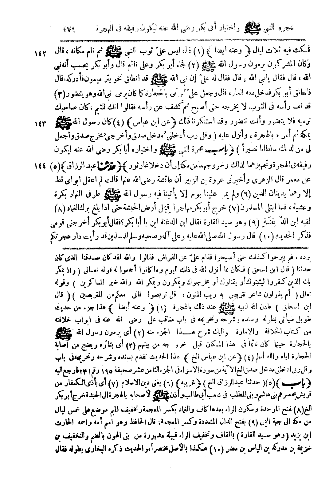 برده. فلم يبرحوا كذلك حتى أصبحوا فقام على عن الفراش فقالوا والله لقد كان صدقنا الذى كان حدثنا (قال ابن اسحق) فكان مما أنزل الله فى ذلك اليوم وما كانوا أجمعوا له قوله تعالى {واذ يمكر بك الذين كفروا ليثبتوك أو يقتلوك أو يخرجوك ويمكرون ويمكر الله والله خير الماكرين} وقوله تعالى {أم يقولون شاعر نتربص به ريب المنون، قل تربصوافانى معكم من المتربصين} (قال ابن اسحاق) فاذن الله لنبيه صلى الله عليه وسلم عند ذلك بالهجرة (1) (وعنه أيضا) هذا جزء من تحديث طويل سيأتى بطوله وسنده وشارخه وتخريجه فى باب مناقب على رضى الله عنه فى ابواب خلافته من كتاب الخلافة والامارة واليك شرح هذا الجزء منه (2) أى يرمون رسول الله صلى الله عليه وسلم بالحجارة حينما كان نائما فى هذا المسكان قبل خروجه من بينم (3) أى يتأوّه ويضج من اصابة الحجارة اياه والله أعلم (4) (عن ابن عباس الخ) هذا الحديث تقدم بسنده وشرحه وتخريجه فى باب وقل ربى ادخلنى مدخل صدق الخ الآية من سورة الاسراء فى الجزء الثامن عشر صحيفة 195 رقم 231 فارجع اليه (باب) (5) (حدثنا عبدالرزاق الخ) (غريبه) (6) يعنى دين الاسلام (7) أى بأذى الكفار من قريش بحصرهم بنى هاشم وبنى المطلب فى شعب أبى طالب وأذن صلى الله عليه وسلم لأصحابه بالهجرة الى الحبشة خرج أبو بكر الخ (8) بفتح الموحدة وسكون الراء بعدها كاف والغماد بكسر المعجمة وتخفيف الميم موضع على خمس ليال من مكة الى جهة اليمن (9) بفتح الدال المشددة وكسر المعجمة: قال الحافظ وهو امم أمه واسمه الحارث ابن يزيد (وهو سيد القارة) بالقاف وتخفيف الراء قبيلة مشهورة من بنى الهون بالضم والتخفيف أن خزيمة بن مدركه بن الياس بن مضر (10) هكذا بالأصل مختصرا، والحديث ذكره البخارى بطوله فقال