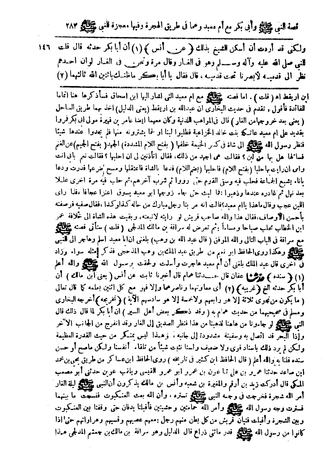 ابن أريقط اهـ (قلت). اما قصته صلى الله عليه وسلم مع ام معبد الى اشار اليها ابن اسحاق فسأذكرها هنا اتماما للفائدة فأقول، تقدم فى حديث البخارى ان عبد الله بن اريقط (يعنى الدليل) اخذ بهما طريق الساحل (يعنى بعدد خروجها من الغار) قال فى المواهب اللدنية وكان معهما ايضا عامر بن فهيرة مولى ابى بكر فمروا بقديد على ام معبد عاتكة بفت خالد الخزاعية فطلبوا لبنا او لحما يشترونه منها فلم يجدوا عندها شيئا فنظر رسول الله صلى الله عليه وسلم الى شاة فى كسر الخيمة خلفها (بفتح اللام المشددة) الجهد (بفتح الجيم) عن الغنم فسالها هل بها من لبن؟ فقالت هى اجهد من ذلك، فقال أتأذنين لى أن احلبها؟ فقالت نعم بابى انت وامى ان رايت بها حلبا (بفتح اللام) فاحلبها (بضم اللام) فدعا بالشاة فاعتقلها ومسح ضرعها فدرت ودعا باناء يشبع الجماعة فحلب فيه وسقى القوم حتى رووا ثم شرب آخرهم، ثم حلب فيه مرة اخرى عللا بعد نهل ثم غادره عندها وذهبوا: فما لبث حتى جاء زوجها ابو معبد يسوق اعنزا عجافا، فلما راى اللبن عجب وقال ما هذا يا ام معبد؟ قالت انه مر بنا رجل مبارك من حاله كذا وكذا، فقال صفيه فوصفته بأحسن الأوصاف، فقال هذا والله صاحب قريش لو رأيته لاتبعته، وبقيت هذه الشاة الى خلافة عمر ابن الخطاب تحلب صباحا ومساءًا: ثم تعرض له سراقة بن مالك المدلجى (قلت) ستأتى قصته صلى الله عليه وسلم مع سراقة فى الباب التالى والله الموفق (قال عبد الله بن وهب) بلغنى ان ابا معبد اسلم وهاجر الى النبى صلى الله عليه وسلم وهكذا روى الحافظ ابو نعيم من طريق عبد الملك بن وهب المذحجى فذكر مثله سواء وزاد فى اخرى قال عبد الملك بلغنى أن أم معبد هاجرت وأسلمت ولحقت برسول الله صلى الله عليه وسلم والله أعلم (1) (سنده) حدّثنا عفان قال حدثنا همام قال أخبرنا ثابت عن أنس (يعنى ابن مالك) أن أبا بكر حدثه الخ (غريبه) (2) أى معاونهما وناصرهما وإلا فهو مع كل اثنين بعلمه كما قال تعالى {ما يكون من نحوى ثلاثة إلا هو رابعهم ولا خمسة إلا هو سادسهم الآية} (تخريجه) أخرجه البخارى ومسلم فى صحيحيهما من حديث همام به (وقد ذكر بعض أهل السير) ان أبا بكر لما قال ذلك قال النبى صلى الله عليه وسلم لو جاءونا من ها هنا لذهبنا من هذا فنظر الصديق إلى الغار وقد انفرج من الجانب الآخر وإذا البحر قد اتصل به وسفينة مشدودة إلى جانبه، وهذا ليس بمنكر من حيث القدرة الظيمة ولكن لم يرد ذلك باسناد قوى ولا ضعيف ولسنا نثبت شيئًا من تلقاء أنفسنا ولكن ما صح أو حسن سنده قلنا به والله أعلم (قال الحافظ ابن كثير فى تاريخه) روى الحافظ ابن عساكر من طريق يحيى بن محمد ابن مساعد حدثنا عمرو بن على ثنا عون بن عمرو القيسى ويلقب عوين حدثنى أبو مصعب المكى قال أدركت زيد بن أرقم والمغيرة بن شعبه وأنس بن مالك يذكرون أن النبى صلى الله عليه وسلم ليلة الغار أمر الله شجرة فخرجت فى وجه النبى صلى الله عليه وسلم تستره، وأن الله بعث العنكبوت فنسجت ما بينهما فسترت وجه رسول الله صلى الله عليه وسلم وأمر الله حمامتين وحشيتين فأبلتا يدفان حتى وقفتا بين العنكبوت وبين الشجرة وأقبلت فتيان قريش من كل بطن منهم رجل: معهم عصيهم وقسيهم وهراواتهم حتى اذا كانوا من رسول الله صلى الله عليه وسلم قدر مائتى ذراع قال الدليل وهو سراقة بن مالك بن جشم المدلجي هذا