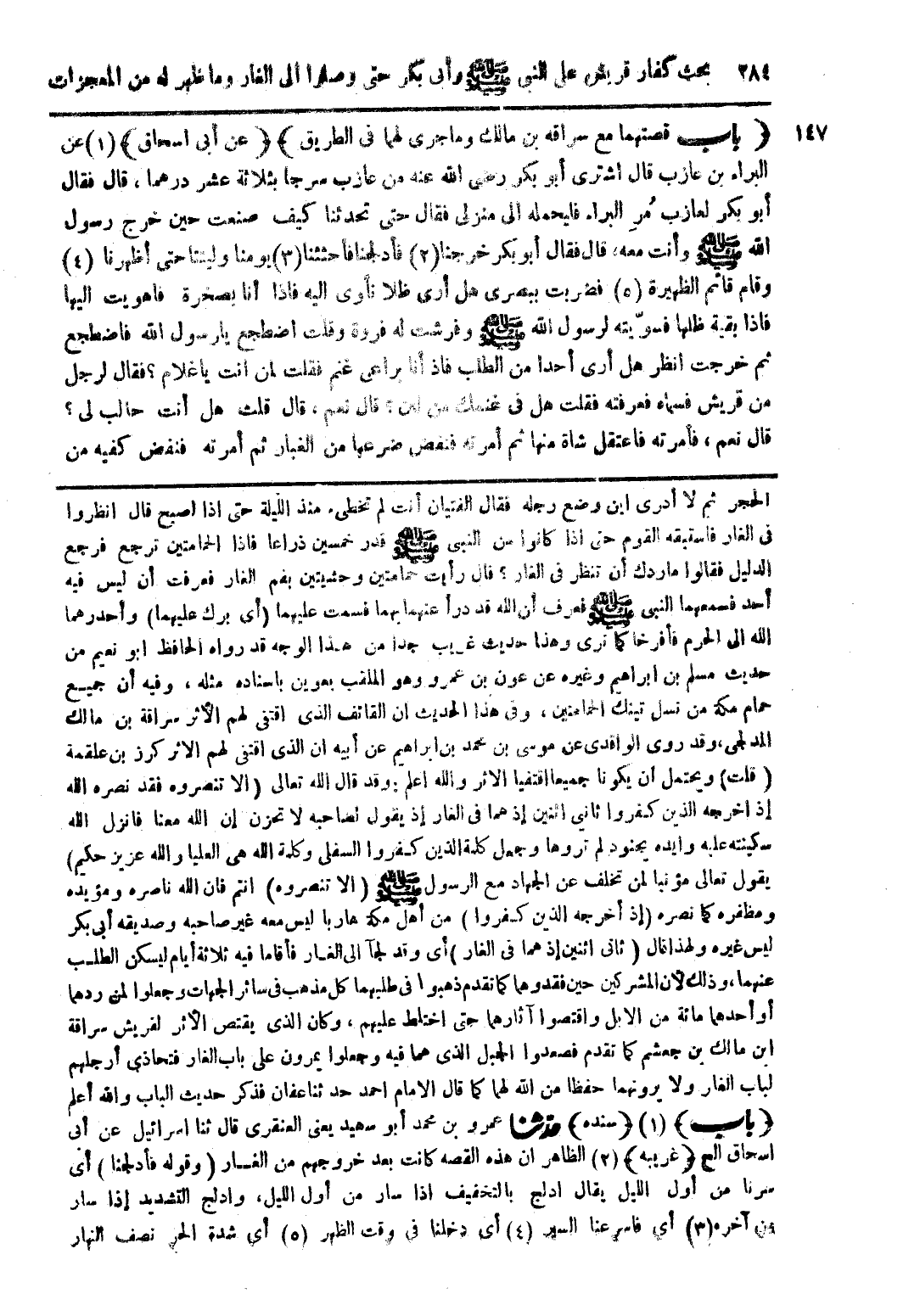(باب قصتهما مع سراقه بن مالك وما جرى لهما فى الطريق) (عن أبى اسحاق) عن البراء بن عازب قال اشترى أبو بكر رضي الله عنه من عازب سرجا بثلاثة عشر درهما، قال فقال أبو بكر لعازب مر البراء فليحمله الى منزلى فقال حتى تحدثنا كيف صنعت حين خرج رسول الله صلى الله عليه وسلم وأنت معه، قال فقال أبو بكر خرجنا فأدلجنا فأحثثنا يومنا وليلتنا حتى أظهرنا وقام قائم الظهيرة فضربت ببصرى هل أرى ظلا نأوى اليه فاذا أنا بصخرة فاهويت اليها فاذا بقية ظلها فسوّيته لرسول الله صلى الله عليه وسلم وفرشت له فروة وقلت اضطجع يا رسول الله فاضطجع ثم خرجت انظر هل أرى أحدا من الطلب فاذ أنا براعى غنم فقلت لمن انت يا غلام؟ فقال لرجل من قريش فسماه فعرفته فقلت هل فى غنمك من لبن؟ قال نعم، قال قلت هل أنت حالب لى؟ قال نعم، فأمرته فاعتقل شاة منها ثم أمرته فنفض ضرعها من الغبار ثم أمرته فنفض كفيه من