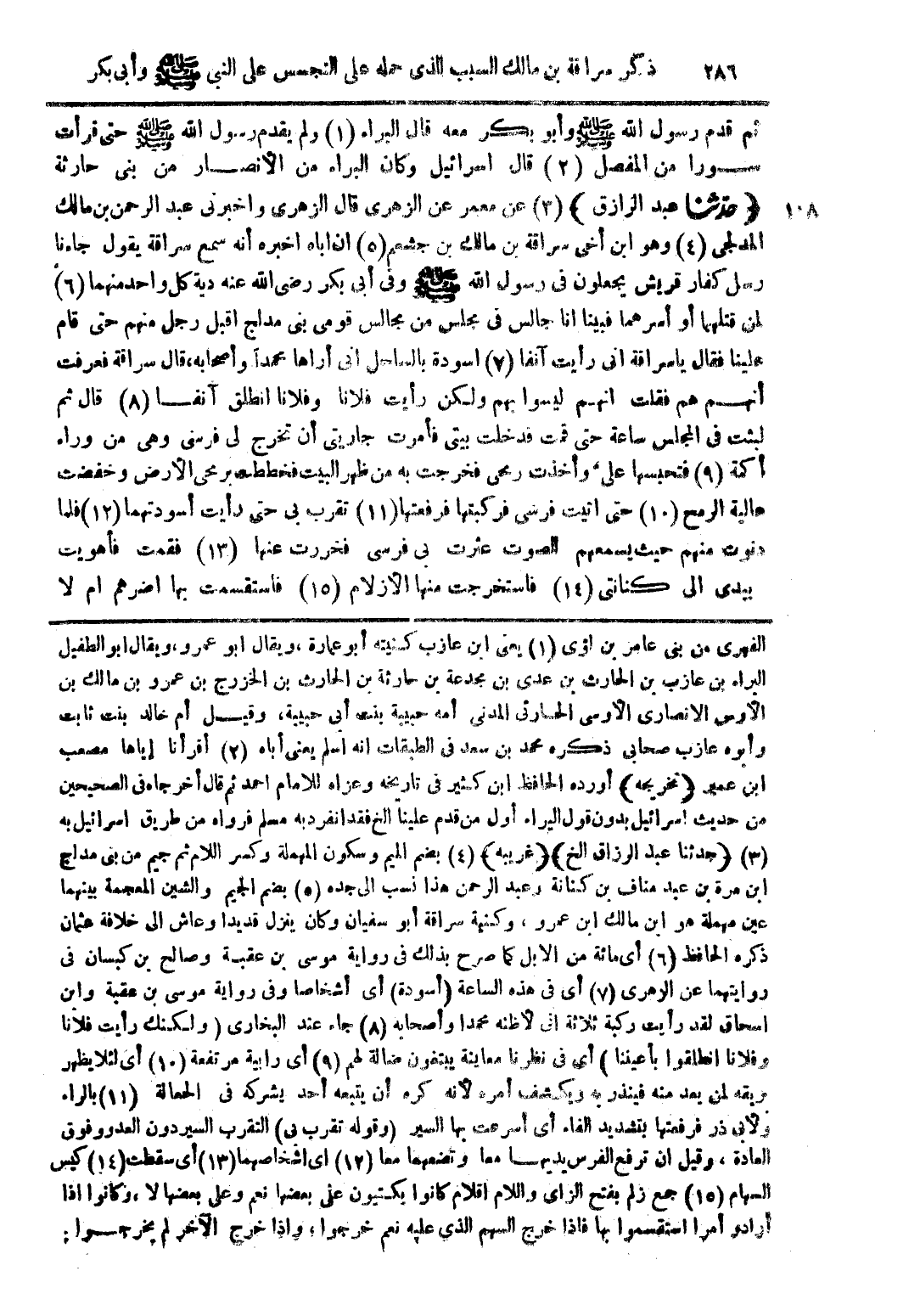 الفهري من بني عامر بن لؤى (1) يعنى ابن عاوب كنيته أبو عمارة، ويقال ابو عمرو، ويقال ابو الطفيل البراء بن عازب بن الحارث بن عدى بن مجدعة بن حارثة بن الحارث بن الخزرج بن عمرو بن مالك بن الأوس الانصارى الأوسى الحارثى المدنى أمه حبيبة بنت أبى حبيبة، وقيل أم خالد بنت ثابت وأبوه عازب صحابى ذكره محمد بن سعد فى الطبقات انه اسلم يعنى أباه (2) أقرأنا إياها مصعب ابن عمير (تخريجه) أورده الحافظ ابن كثير فى تاريخه وعزاه للامام احمد ثم قال أخرجاه فى الصحيحين من حديث اسرائيل بدون قول اليراء أول من قدم علينا الخ فقد انفرد به مسلم فرواه من طريق اسرائيل به (3) (حدثنا عبد الرزاق الخ) (غريبه) (4) بضم الميم وسكون المهملة وكسر اللام ثم جيم من بنى مداج ابن مرة بن عبد مناف بن كنانة وعبد الرحمن هذا نسب الى جده (5) بضم الجيم والشين المعجمة بينهما عين مهملة هو ابن مالك ابن عمرو، وكنية سراقة أبو سفيان وكان ينزل قديدا وعاش الى خلافة عثمان ذكره الحافظ (6) أى مائة من الابل كما صرح بذلك فى رواية موسى بن عقبة وصالح بن كبسان فى روايتهما عن الزهرى (7) أى فى هذه الساعة (أسودة) أى أشخاصا وفى رواية موسى بن عقبة وابن اسحاق لقد رأيت ركبة ثلاثة انى لأظنه محمدا وأصحابه (8) جاء عند البخارى (ولكنك رأيت فلانا وفلانا انطلقوا بأعيننا) أى فى نظرنا معاينة يبتغون ضالة لهم (9) أى رابية مرتفعة (10) أى لئلا يظهر بريقه لمن يعد منه فينذر به ويكسف أمره لأنه كره أن يتبعه أحد يشركه فى الحمالة (11) بالراء ولأبى ذر فرفعتها بتشديد الفاء أى أسرعت بها السير (وقوله تقرب بى) التقرب السير دون العدو وفوق العادة، وقيل ان ترفع الفرس يديها معا وتضعهما معا (12) اى اشخاصهما (13) أى سقطت (14) كيس السهام (15) جمع زلم بفتح الزاى واللام اقلام كانوا يكتبون على بعضها نعم وعلى بعضها لا، وكانوا اذا أرادوا أمرا استقسموا بها فاذا خرج السهم الذى عليه نعم خرجوا، واذا خرج الآخر لم يخرجوا: