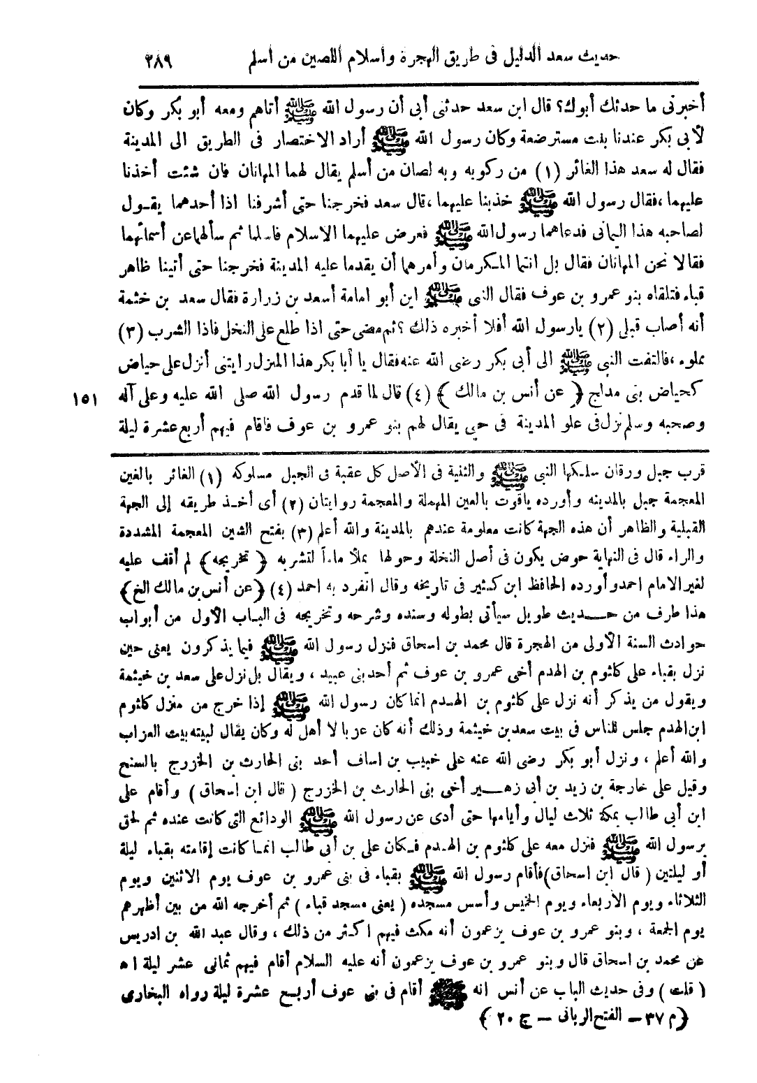 أخبرني ما حدثك أبوك؟ قال ابن سعد حدثي أبى أن رسول الله صلى الله عليه وسلم أتاهم ومعه أبو بكر وكان لأبى بكر عندنا بنت مسترضعة وكان رسول الله صلى الله عليه وسلم أراد الاختصار فى الطريق الى المدينة فقال له سعد الغائر من ركوبه وبه لصان من أسلم يقال لهما المهانان فإن شئت أخذنا عليهما، فقال رسول الله صلى الله عليه وسلم خذ بنا عليهما، قال سهل فخرجنا حتى أشرفنا اذا أحدهما يقول لصاحبه هذا اليمانى فدعاهما رسول الله صلى الله عليه وسلم فعرض عليهما الاسلام فاسلما ثم سألهما عن أسمائهما فقالا نحن المهانان فقال بل انتما المكرمان وأمرهما أن يقدما عليه المدينة فخرجنا حتى أتينا ظاهر قباء فتلقاه بنو عمرو بن عوف فقال النبى صلى الله عليه وسلم اين أبو امامة أسعد بن زرارة فقال سعد بن خثمة أنه أصاب قبلى يا رسول الله أفلا أخبره ذلك؟ ثم مضى حتى اذا طلع على النخل فاذا الشرب مملوء، فالتفت النبي صلى الله عليه وسلم الي أبي بكر رضي الله عنه فقال يا أبا بكر هذا المنزل رأيتني أنزل علي حياض کحياض بني مدلج (عن أنس بن مالك) قال لما قدم رسول الله صلى الله عليه وعلى آله وصحبه وسلم نزل فى علو المدينة فى حي يقال لهم بنو عمرو بن عوف فاقام فيهم أربع عشرة ليلة