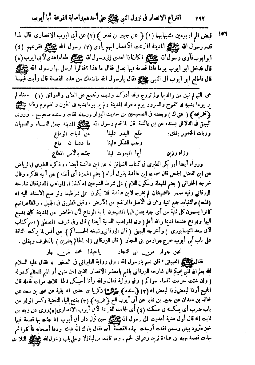ورواه أيضًا أبو بكر الطبرى فى كتاب الشمائل له عن ابن عائشة أيضًا، وذكره الطبرى فى الرياض عن ابن الفضل الجمحى قال سمعت ابن عائشة يقول أراه (بضم الهمزة أى أظنه) عن أبيه فذكره وقال خرجه الحلوانى (بضم المهملة وسكون اللام) على شرط الشيخين اهـ كذا فى المواهب اللدنية قال شارحه الزرقانى وفيه معمر فالشيخان لم يخرجا لابن عائشة فلا يكون على شرطهما ولو صح الإسناد إليه اهـ (قلت) والثنيات جمع ثنية وهى فى الأصل ما ارتفع من الأرض، وقيل الطريق فى الجبل، والظاهر أنهم كاوا يسمون كل ثنية من أى جهة يصل إليها المشيعون بثنية الوداع لأن الحاضر من المدينة كان يشيع إليه ويودع عنده قديمًا والله أعلم (وفى المواهب المدنية أيضًا) قال وفى شرف المصطفي) اسم كتاب لأبى سعد النيسابوري) وأخرجه البيهقى (قال الرزرقانى وشيخه الحاكم) عن أنس لما بركت الناقة على باب أبى أيوب خرج جوار من بنى النجار (قال الزرقانى زاد الحاكم يضربن) بالدفوف ويقلن.