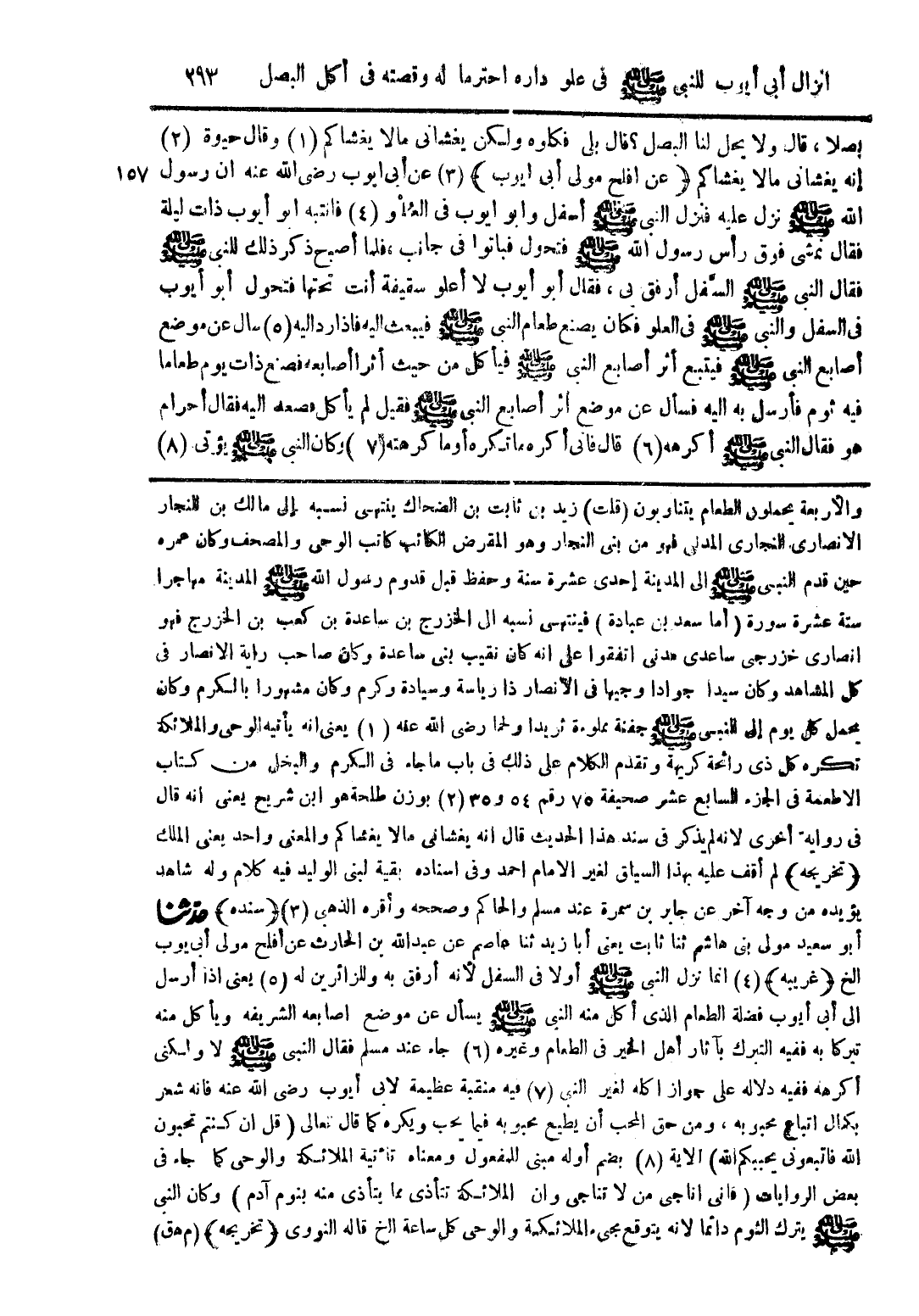 بصلا، قال ولا يحل لنا البصل؟ قال بلى فكلوه ولكن يغشانى مالا يغشاكم وقال حيوة إنه يغشانى ما يغشاكم (عن افلح مولى أبى أيوب) عن أبى ايوب رضي الله عنه ان رسول الله صلى الله عليه وسلم نزل عليه فنزل النبى صلى الله عليه وسلم أسفل وابو ايوب فى العلو فانتبه ابو أيوب ذات ليلة فقال نمشى فوق رأس رسول الله صلى الله عليه وسلم فتحول فباتوا فى جانب، فلما أصبح ذكر ذلك للنبى صلى الله عليه وسلم فقال النبى صلى الله عليه وسلم السَّفل أرفق بى، فقال أبو أيوب لا أعلو سقيفة أنت تحتها فتحول أبو أيوب فى السفل والنبى صلى الله عليه وسلم فى العلو فكان يصنع طعام النبى صلى الله عليه وسلم فيبعث اليه فاذا رد اليه سال عن موضع أصابع النبى صلى الله عليه وسلم فيتبع أثر أصابع النبى صلى الله عليه وسلم فيأكل من حيث أثر أصابعه فصنع ذات يوم طعاما فيه ثوم فأرسل به اليه فسأل عن موضع اثر أصابع النبى صلى الله عليه وسلم فقيل لم يأكل فصعد اليه فقال أحرام هو فقال النبى صلى الله عليه وسلم أكرهه قال فانى أكره ما تكره أو ما ككرهته وكان النبى صلى الله عليه وسلم يؤتى