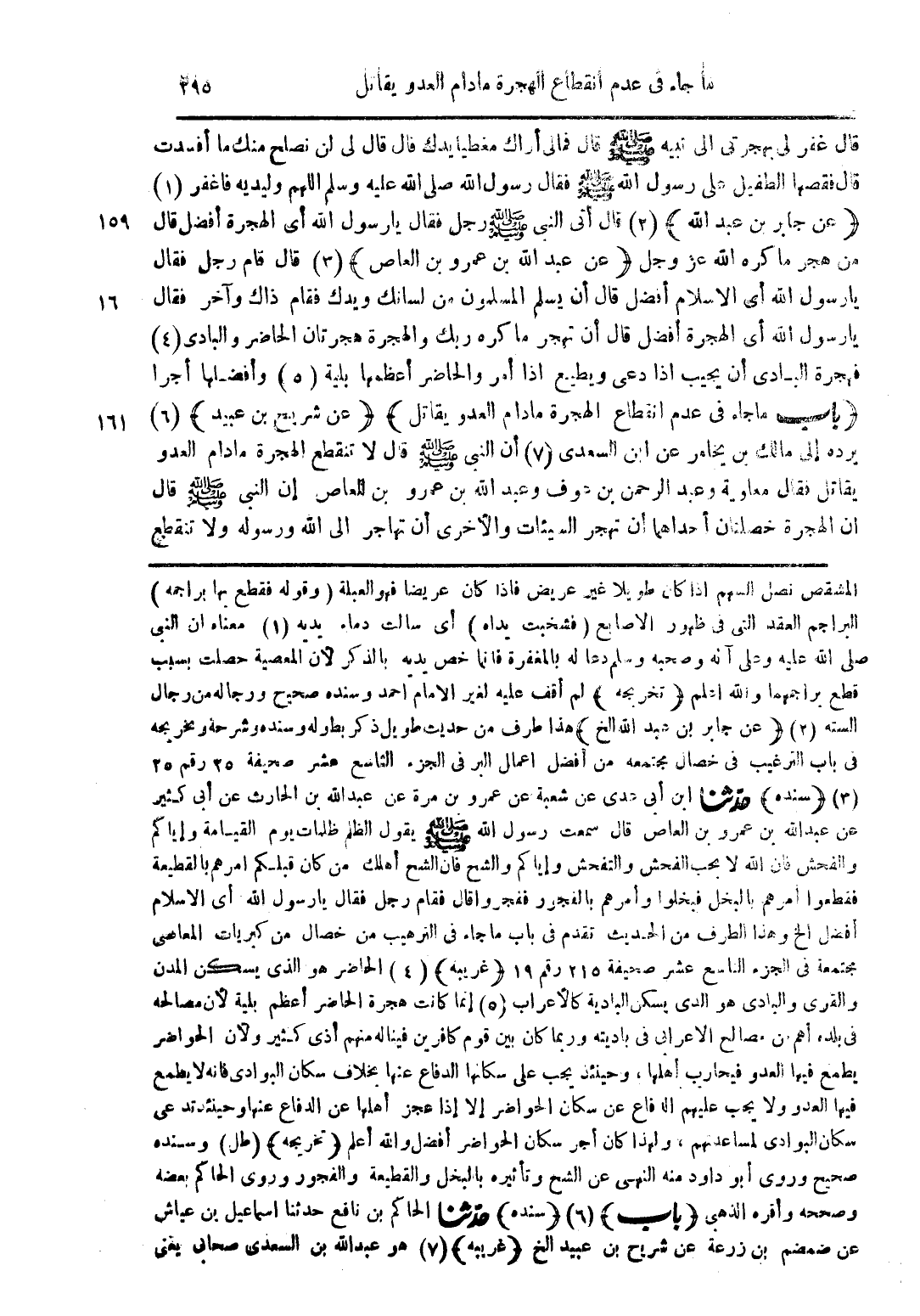 المشقص نصل السهم اذا كان طويلا غير عريض فاذا كان عريضا فهو العبلة (وقوله فقطع بها براجمه) البراجم العقد التى فى ظهور الاصابع (فشخبت يداه) اى سالت دماء يديه (1) معناه ان النبى صلى الله عليه وسلم وعلى اله وصحبه وسلم دعا له بالمغفرة فانما خص يديه بالذكر لان المعصية حصلت بسبب قطع براجمهما والله اعلم (تخريجه) لم اقف عليه لغير الامام احمد وسنده صحيح ورجاله من رجال الستة (2) (عن جابر بن عبد الله الخ) هذا طرف من حديث طويل ذكر بطوله وسنده وشرحه وتخريجه فى باب الترغيب فى خصال مجتمعه من افضل اعمال البر فى الجزء التاسع عشر صحيفة 35 رقم 23 (3) (سنده) حدثنا ابن ابى عدى عن شعبة عن عمرو بن مرة عن عبد الله بن الحارث عن ابى كثير عن عبد الله بن عمرو بن العاص قال سمعت رسول الله صلى الله عليه وسلم يقول الظلم ظلمات يوم القيامة واياكم والفحش فان الله لا يحب الفحش والتفحش واياكم والشح فان الشح اهلك من كان قبلكم امرهم بالقطيعة فقطعوا امرهم بالبخل فبخلوا وامرهم بالفجور ففجر واقال فقام رجل فقال يا رسول الله اى الاسلام افضل الخ وهذا الطرف من الحديث تقدم فى باب ما جاء فى الترهيب من خصال من كبريات المعاصى مجتمعه فى الجزء التاسع عشر صحيفة 215 رقم 19 (غريبة) (4) الحاضر هو الذى سكن المدن والقرى والبادى هو الذى يسكن البادية كالاعراب (5) انما كانت هجرة الحاضر اعظم بلية لان مصالحه فى بلد، اهم من مصالح الاعرابى فى باديته وربما كان بين قوم كافرين فينا له منهم اذى كثير ولان الحواضر يطمع فيها العدو فيحارب اهلها، وحينئذ بجب على سكانها الدفاع عنها بخلاف سكان البوادى فانه لا يطمع فيها العدو ولا يوجب عليهم الدفاع عن سكان الحواضر الا اذا عجز أهلها عن الدفاع عنها وحينئذ تدعى سكان البوادى لمساعدتهم، ولهذا كان اجر سكان الحواضر افضل والله اعلم (تخريجه) (طل) وسنده صحيح وروى أبو داود منه النهى عن الشح وتأثيره بالبخل والقطيعة والفجور وروى الحاكم بعضه وصححه واقره الذهبى (باب) (6) (سنده) حدثنا الحاكم بن نافع حدثنا اسماعيل بن عياش عن ضمضم بن زرعة عن شريح بن عبيد الخ (غريبة) (7) هو عبد الله بن السعدي صحابي يغني