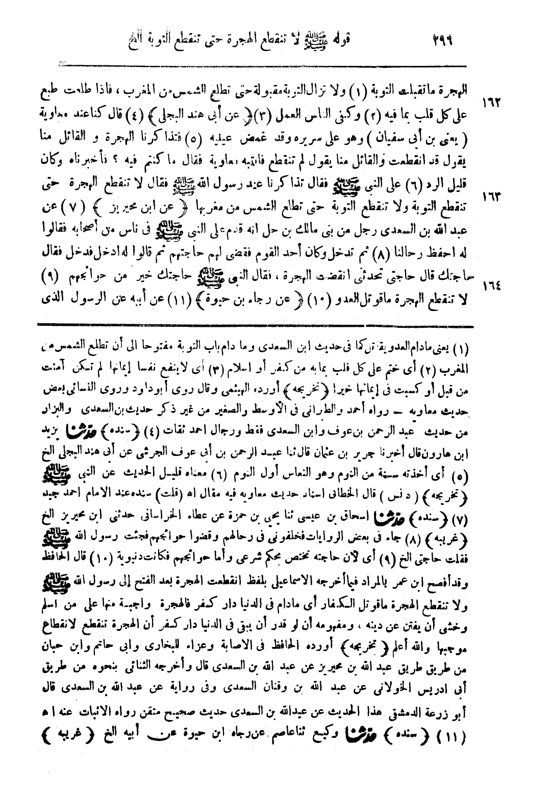 (1) يعني ما دام العدو يقاتل كما فى حديث ابن السعدى وما دام باب التوبة مفتوحًا إلى أن تطلع الشمس من المغرب (2) أى ختم على كل قلب بما به من كفر أو أسلام (3) أى لا ينفع نفسًا إيمانها لم تكن آمنت من قبل أو كسبت فى إيمانها خيرًا (تخريجه) أورد، الهيثمى وقال روى أبو داود وروى النسائى بعض حديث معاويه- رواه أحمد والطبرانى فى الأوسط والصغير من غى ذكر حديث بن السعدى والبزار من حديث عبد الرحمن بن عوف وابن السعدى فقط ورجال أحمد ثقات (4) (سنده) حدثنا يزيد ابن هارون قال أخبرنا جرير بن عثمان قال ثنا عبد الرحمن بن أبى عوف الجرشى عن أبى هند اليجلى الخ (5) أى أخذته سنة من النوم وهو النعاس أول النوم (6) معناه قليل الحديث عن النبى صلى الله عليه وسلم (تخريجه (د نس) قال الخطابى إسناد حديث معاوية فيه مقال اهـ (قلت) سنده عند الإمام أحمد جيد (7) (سنده) حدثنا إسحاق بن عيسى ثنا يحيى بن حمزة عن عطاء الخراسانى حدثنى ابن محيريز الخ (غريبة) (8) جاء فى بعض الروايات فخلفونى فى رحالهم وقضوا حوائجهم فجئت رسول الله صلى الله عليه وسلم فقلت حاجتى الخ (9) أى لأن حاجته تختص بحكم شرعى وأما حوائجهم فكانت دنيوية (10) قال الحافظ وقد أفصح ابن عمر بالمراد فيما أخرجه الاسماعيلى بلفظ انقطعت الهجرة بعد الفتح إلى رسول الله صلى الله عليه وسلم ولا تنقطع الهجرة ما قوتل الكفار أى ما دام فى الدنيا دار كفر فالهجرة واجبة منها على من أسلم وخشى أن يفتن عن دينه، ومفهومه أن لو قدر أن يبقى فى الدنيا دار كفر أن الهجرة تنقطع لانقطاع موجبها والله أعلم (تخريجه) أورده الحافظ فى الإصابة وعزاء للبخارى وأبى حاتم وابن حبان من طريق طريق عبد الله محيريز عن عبد الله بن السعدى قال وأخرجه الثنائى بنحوه من طريق أبى ادريس الخولانى عن عبد الله بن وقنان السعدى وفى رواية عن عبد الله بن السعدى قال أبو زرعة الدمشقى هذا الحديث عن عبد الله بن السعدى حديث صحيح متقن رواه الإثبات عنه اهـ (11) (سنده) حدثنا وكيع ثنا عاصم عن رجاه ابن حيوة عن أبيه الخ (غريبه)
