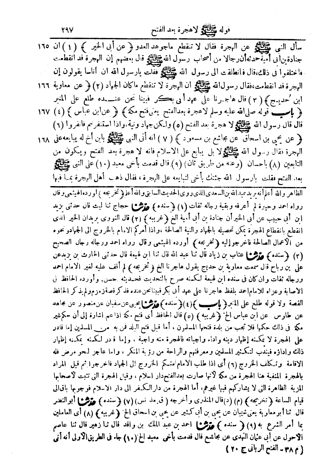 سأل النبي صلى الله عليه وسلم عن الهجرة فقال لا تنقطع ما جوهد العدو (عن أبى الخير) ان جنادة بن ابى أمية حدثه أن رجالا من أصحاب رسول الله صلى الله عليه وسلم قال بعضهم إن الهجرة قد انقطعت فاختلفوا فى ذلك، قال فانطلقت الى رسول الله صلى الله عليه وسلم فقلت يا رسول الله ان أناسا يقولون إن الهجرة قد انقطعت، فقال رسول الله صلى الله عليه وسلم ان الهجرة لا تنقطع ما كان الجهاد (عن معاوية ابن حديج) قال هاجرنا على عهد أبى بكر فبينا نحن عنده طلع على المنبر (باب قوله صلى الله عليه وسلم لا هجرة بعد الفتح يعنى فتح مكة) (عن ابن عباس) قال قال رسول الله صلى الله عليه وسلم لا هجرة بعد الفتح ولكن جهاد ونية، واذا استنفرتم فانفروا (عن يحيى بن اسحاق عن مجاشع بن مسعود) انه أتى النبى صلى الله عليه وسلم بابن أخ له يبايعه على الهجرة فقال رسول الله صلى الله عليه وسلم لا بل يبايع على الاسلام فانه لا هجرة بعد الفتح ويكون من التابعين باحسان (وعنه من طريق ثان) قال قدمت بأخى معبد على النبى صلى الله عليه وسلم بعد الفتح فقلت يا رسول الله جئتك بأخى لتبايعه على الهجرة، فقال ذهب أهل الهجرة بما فيها