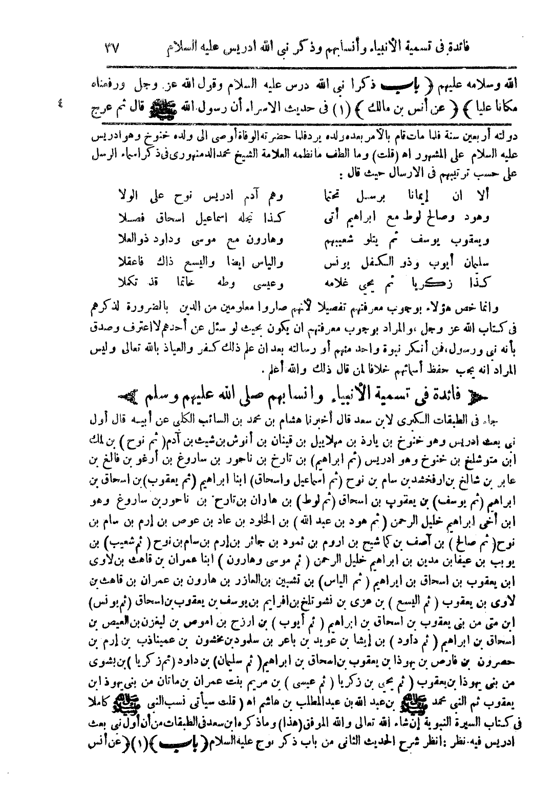 دولته أربعين سنة فلما مات قام بالأمر بعده ولده يرد فلما حضرته الوفاة أوصى الى ولده خنوخ وهو ادريس عليه السلام على المشهور اهـ (قلت) وما ألطف ما نظم العلامة الشيخ محمد الدمنهورى فى ذكر اسماء الرسل على حسب ترتيبهم فى الارسال حيث قال: