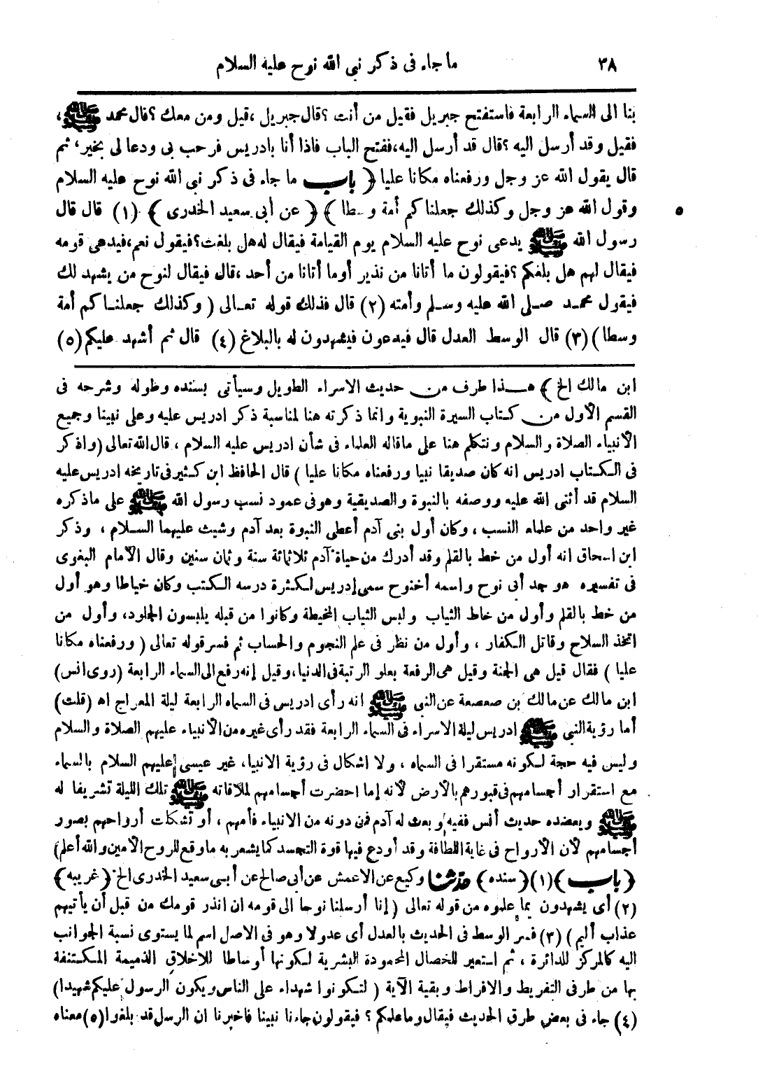 بنا إلى السماء الرابعة فاستفتح جبريل فقيل من أنت؟ قال جبريل، فقيل ومن معك؟ قال محمد صلى الله عليه وسلم فقيل وقد أرسل اليه؟ قال قد أرسل اليه، ففتح الباب فاذا أنا بادريس فرحب بى ودعا لى بخير، ثم قال يقول الله عز وجل ورفعناه مكانا عليا (باب ما جاء فى ذكر نبى الله نوح عليه السلام وقول الله عز وجل وكذلك جعلناكم أمة وسطا) (عن أبى سعيد الخدرى) (1) قال قال رسول الله صلى الله عليه وسلم يدعى نوح عليه السلام يوم القيامة فيقال له هل بلغت؟ فيقول نعم، فيدعى قومه فيقال لهم هل بلغكم؟ فيقولون ما أتانا من نذير أو ما أتانا من أحد، قال فيقال لنوح من يشهد لك فيقول محمد صلى الله عليه وسلم وأمته (2) قال فذلك قوله تعالى {وكذلك جعلناكم أمة وسطا} (3) قال الوسط العدل قال فيدعون فيشهدون له بالبلاغ (4) قال ثم أشهد عليكم (5)