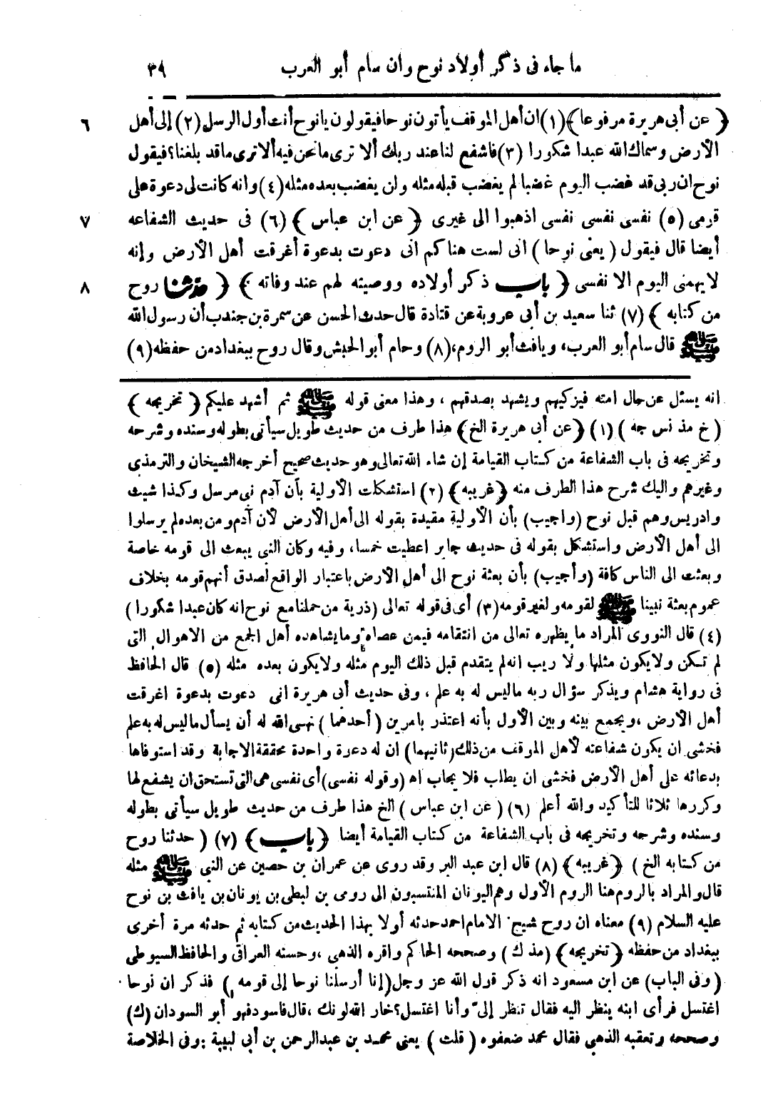 (عن أبي هريرة مرفوعا) (1) ان أهل الموقف يأتون نوحا فيقولون يا نوح أنت أول الرسل (2) إلى أهل الأرض وسماك الله عبدا شكورا (3) فاشفع لنا عند ربك ألا ترى ما نحن فيه ألا ترى ما قد بلغنا؟ فيقول نوح ان ربى قد غضب اليوم غضبا لم يغضب قبله مثله ولن يغضب بعده مثله (4) وانه كانت لى دعوة على قومى (5) نفسى نفسى نفسى اذهبوا الى غيرى (عن ابن عباس) (6) فى حديث الشفاعة أيضا قال فيقول (يعنى نوحا) انى لست هنا كم انى دعوت بدعوة أغرقت أهل الأرض وإنه لا يهمنى اليوم الا نفسى (باب ذكر أولاده ووصيته لهم عند وفاته) (حدثنا روح من كتابه) (7) ثنا سعيد بن أبى عروبة عن قتادة قال حدث الحسن عن سمرة بن جندب أن رسول الله صلى الله عليه وسلم قال سام أبو العرب، ويافث أبو الروم، (8) وحام أبو الحبش وقال روح ببغداد من حفظه (9)