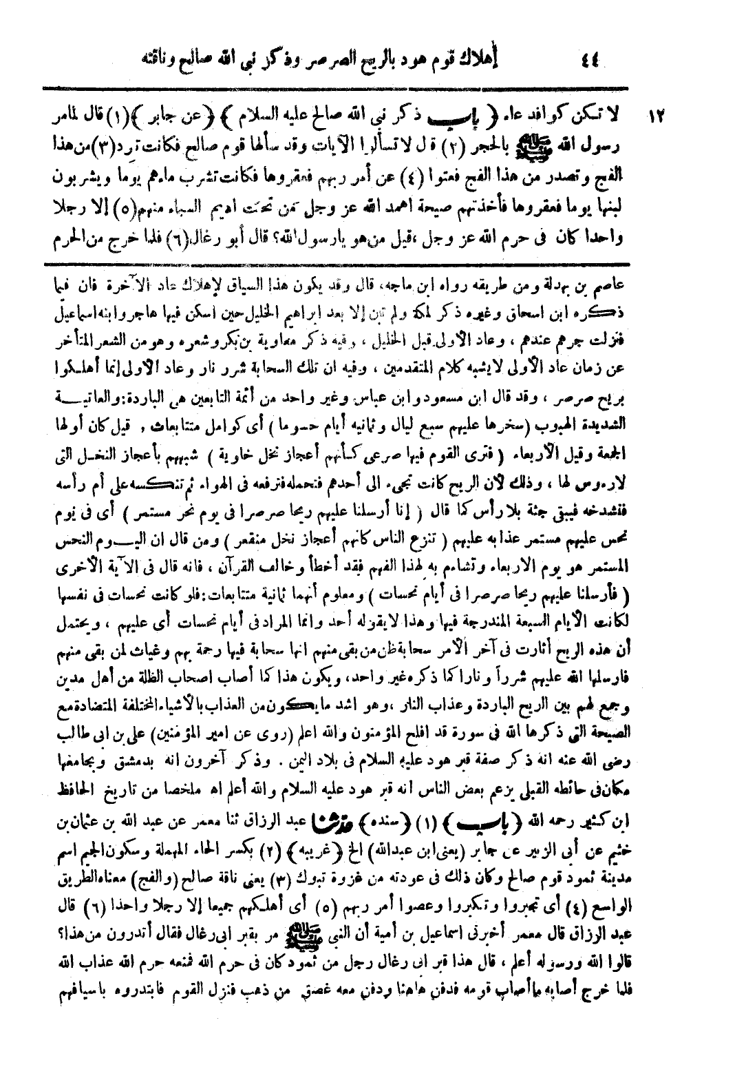 عاصم بن بهدلة ومن طريقه رواه ابن ماجه، قال وقد يكون هذا السياق لإهلاك عاد الآخرة فان فيما ذكره ابن اسحاق وغيره ذكر لمكة ولم تبن إلا بعد إبراهيم الخليل حين اسكن فيها هاجر وابنه اسماعيل فنزلت جرهم عندهم، وعاد الأولى قبل الخليل، وفيه ذكر معاوية بن بكر وشعره وهو من الشعر المتأخر عن زمان عاد الأولى لا يشبه كلام المتقدمين، وفيه ان تلك السحابة شرر نار وعاد الأولى إنما أهلكوا بريح صرصر، وقد قال ابن مسعود وابن عباس وغير واحد من أئمة التابعين هى الباردة: والعاتية الشديدة الهبوب (سخرها عليهم سبع ليال وثمانيه أيام حسوما) أى كوامل متتابعات، قيل كان أولها الجمعة وقيل الأربعاء (فترى القوم فيها صرعى كأنهم أعجاز نخل خاوية) شبههم بأعجاز النخل التى لا رءوس لها، وذلك لأن الريح كانت تجئ الى أحدهم فتحمله فترفعه فى الهواء ثم تنكسه على أم رأسه فنشدخه فيبقى جثة بلا رأس كما قال (إنا أرسلنا عليهم ريحا صرصرا فى يوم نحر مستمر) أى فى يوم نحس عليهم مستمر عذابه عليهم (تنزع الناس كانهم أعجاز نخل منقعر) ومن قال ان اليوم النحس المستمر هو يوم الاربعاء وتشاءم به لهذا الفهم فقد أخطأ وخالف القرآن، فانه قال فى الآية الأخرى (فأرسلنا عليهم ريحا صرصرا فى أيام نحسات) ومعلوم أنهما ثانية متتابعات: فلو كانت نحسات فى نفسها لكانت الأيام السبعة المندرجة فيها وهذا لا يقوله أحد وانما المراد فى أيام نحسات أى عليهم، ويحتمل أن هذه الريح أثارت فى آخر الأمر سحابة ظن من بقى منهم انها سحابة فيها رحمة بهم وغياث لمن بقى منهم فارسلها الله عليهم شرراً ونارا كما ذكره غير واحد، ويكون هذا كما أصاب اصحاب الظلة من أهل مدين وجمع لهم بين الريح الباردة وعذاب النار، وهو أشد ما يكون من العذاب بالأشياء المختلفة المتضادة مع الصيحة التى ذكرها الله فى سورة قد افلح المؤمنون والله اعلم (روى عن أمير المؤمنين) على بن ابى طالب رضى الله عنه انه ذكر صفة قبر هود عليه السلام فى بلاد اليمن. وذكر آخرون انه بدمشق وبجامعها مكان فى حائطه القبلى يزعم بعض الناس أنه قبر هود عليه السلام والله أعلم أم مخلصا من تاريخ الحافظ ابن كثير رحمه الله (باب) (1) (سنده) حدثنا عبد الرزاق ثنا معمر عن عبد الله بن عثمان بن خثيم عن أبى الزبير عن جابر (يعنى ابن عبد الله) الخ (غريبه) (2) بكسر الحاء المهملة وسكون الجيم اسم مدينة ثمود قوم صالح وكان ذلك فى عودته من غزوة تبوك (3) يعنى ناقة صالح (والفج) معناه الطريق الواسع (4) أى تجبروا وتكبروا وعصوا أمر ربهم (5) أى أهلكهم جميعا إلا رجلا واحذا (6) قال عبد الرزاق قال معمر أخبرنى اسماعيل بن أمية أن النبى صلى الله عليه وسلم مر بقبر ابى رغال فقال أتدرون من هذا؟ قالوا الله ورسوله أعلم، قال هذا قبر ابى رغال رجل من ثمود كان فى حرم الله فمنعه حرم الله عذاب الله فلما خرج أصابه ما أصاب قومه فدفن هاهنا ودفن معه غصق فنزل القوم فابتدروه بأسيافهم