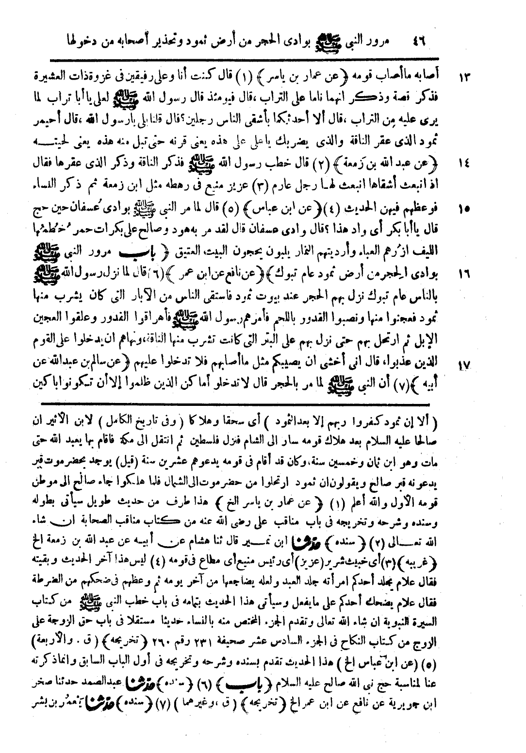 أصابه ما أصاب قومه (عن عمار بن ياسر) (1) قال كنت أنا وعلى رفيقين فى غزوة ذات العشيرة فذكر نصة وذكر انهما ناما على التراب، قال فيومئذ قال رسول الله صلى الله عليه وسلم لعلى يا أبا تراب لما يرى عليه من التراب، قال ألا أحدثكما بأشقى الناس رجلين؟ قال قلنا بلى يا رسول الله، قال أحيمر ثمود الذى عقر الناقة والذى يضربك يا على على هذه يعنى قرنه حتى تبل منه هذه يعنى لحيته (عن عبد الله بن زمعة) (2) قال خطب رسول الله صلى الله عليه وسلم فذكر الناقة وذكر الذى عقرها فقال اذا انبعث أشقاها لها رجل عارم (3) عزيز منيع فى رهطه مثل ابن زمعة ثم ذكر النساء فوعظهم فيهن الحديث (4) (عن ابن عباس) (5) قال لما مر النبى صلى الله عليه وسلم بوادى عسفان حين حج قال يا أبا بكر أى واد هذا؟ قال واد هذا؟ قال وادى عسفان قال لقد مر به هود وصالح على بكرات حمر حطمها الليف ازرهم العباء وأرديتهم النمار يلبون يحجون البيت العتيق (باب مرور النبى صلى الله عليه وسلم بوادى الحجر من أرض ثمود عام تبوك) (عن نافع عن ابن عمر) (6) قال لما نزل رسول الله صلى الله عليه وسلم بالناس عام تبوك نزل بهم الحجر عند بيوت ثمود فاستقى الناس من الآبار التى كان يشرب منها ثمود فعجنوا منها ونصبوا القدور باللحم فأمرهم رسول الله صلى الله عليه وسلم فأهراقوا القدور وعلقوا العجين الإبل ثم ارتحل بهم حتى نزل بهم على البتر التى كانت تشرب منها الناقة، ونهاهم ان يدخلوا على القوم الذين عذبوا، قال انى أخشى أن يصيبكم مثل ما أصابهم فلا تدخلوا عليهم (عن سالم بن عبد الله عن أبيه) (7) أن النبى صلى الله عليه وسلم لما مر بالحجر قال لا تدخلوا أماكن الذين ظلموا إلا أن تكونوا باكين
