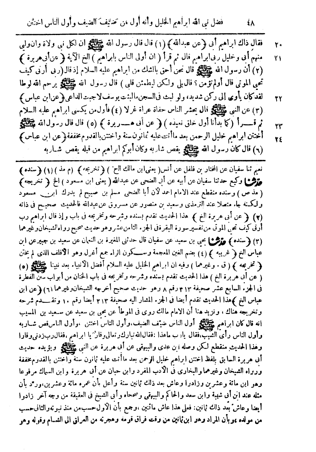 فقال ذاك إبراهيم أبى (عن عبد الله) (1) قال قال رسول الله صلى الله عليه وسلم ان لكل نبى ولاة وان وليي منهم أبى وخليل ربى ابراهيم قال ثم قرأ (أن أولى الناس بابراهيم) الخ الآية (عن أبى هريرة) (2) أن رسول الله صلى الله عليه وسلم قال نحن أحق بالشك من ابراهيم عليه السلام إذ قال (ربى أرنى كيف تحىى الموتى قال أو لم نؤمن؟ قال بلى ولكن يطمئن قلبى) قال رسول الله صلى الله عليه وسلم يرحم الله لوطا لقد كان يأوى الى ركن شديد، ولو لبث فى السجن ما لبثت يوسف لاجبت الداعى (عن ابن عباس) (3) عن النبى صلى الله عليه وسلم قال يحشر الناس حفاة عراة غرلا (4) فأول من يكسى ابراهيم عليه السلام ثم قرأ (كما بدأنا أول خلق نعيده) (عن أبى هريرة) (5) قال قال رسول الله صلى الله عليه وسلم أختن ابراهيم خليل الرحمن بعد ما أتت عليه ثمانون سنة واختن بالقدوم مخففة (عن ابن عباس) (6) قال كان رسول الله صلى الله عليه وسلم يقص شاربه وكان أبوكم ابرهيم من قبله يقص شاربه