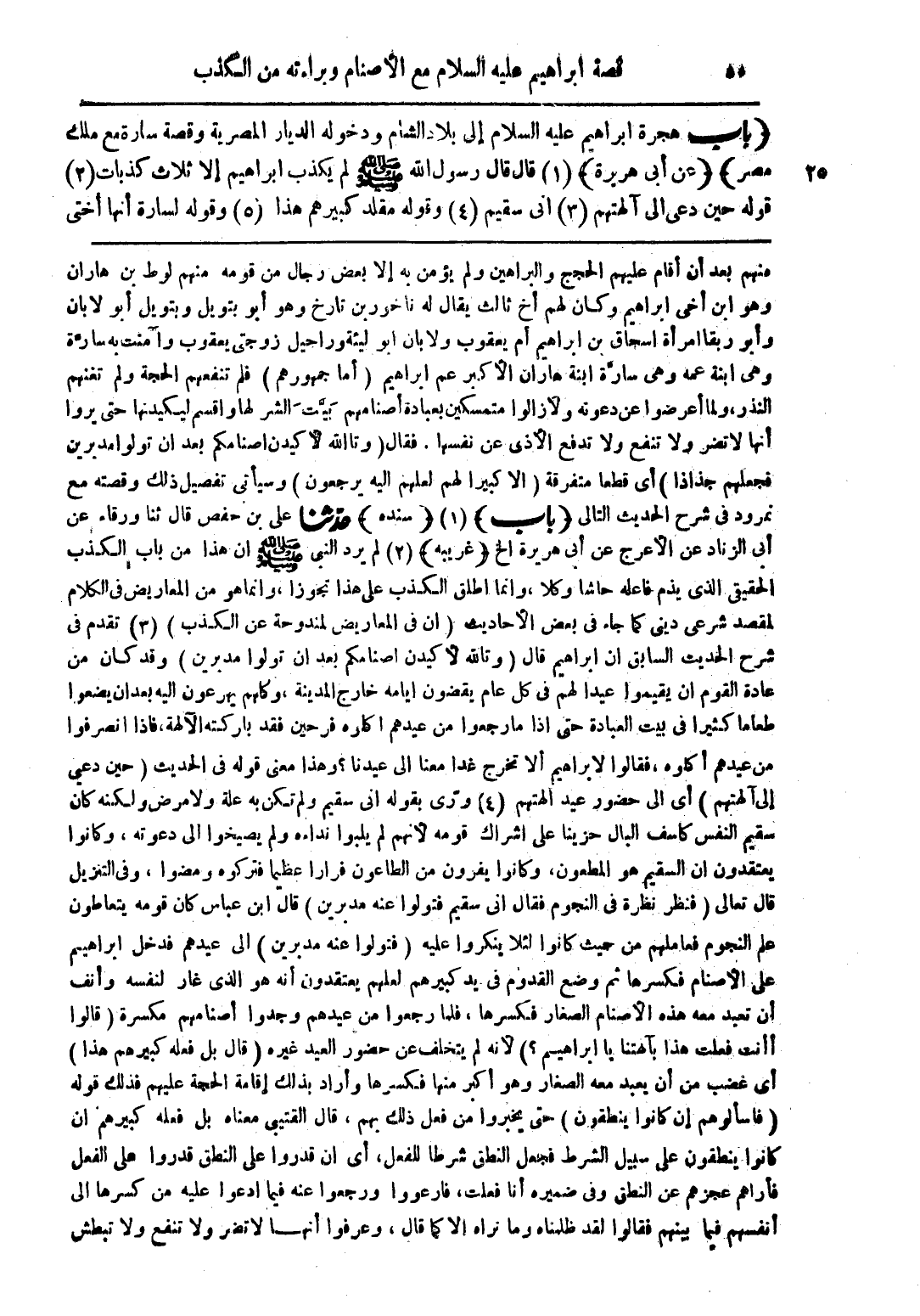 (باب هجرة إبراهيم عليه السلام الى بلاد الشام ودخوله الديار المصرية وقصة سارة مع ملك مصر) (عن أبى هريرة) (1) قال قال رسول الله صلى الله عليه وسلم لم يكذب ابراهيم إلا ثلاث كذبات (3) قوله حين دعى الى آلهتهم (3) انى سقيم (4) وقوله مقلد كبيرهم هذا (5) وقوله لسارة أنها أختي