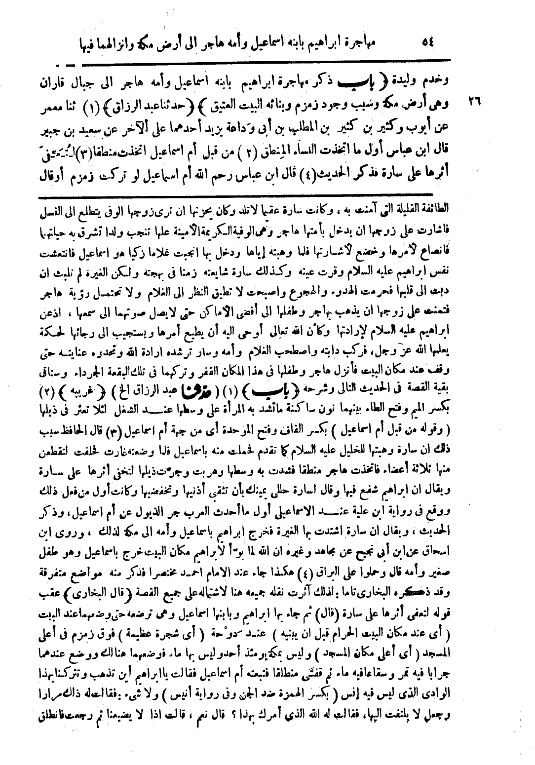الطائفة القليلة التى آمنت به، وكانت سارة عقيما لا تلد وكان يحزنها ان ترى زوجها الوفى يتطلع الى النسل فاشارت على زوجها ان يدخل بأمتها هاجر وهى الوفية الكريمة الأمينة علها تنجب ولدا تشرق به حياتهما فانصاع لأمرها وخضع لأشارتها فلما وهبته إياها ودخل بها انجبت غلاما زكيا هو اسماعيل فانتعشت نفس ابراهيم عليه السلام وقرت عينه وكذلك سارة شايعته زمنا فى بهجته ولكن الغيرة لم تلبث ان دبت الى قلبها فحرمت الهدوء والهجوع واصبحت لا تطيق النظر الى الغلام ولا تحتمل رؤية هاجر فتمنت على زوجها ان يذهب بهاجر وطفلها أقصى الأماكن حتى لا يصل صوتهما الى سمعها، أذعن ابراهيم عليه السلام لإدارتها وكأن الله تعالى أوحى اليه أن يطيع أمرها ويستجيب الى رجائها لحكمة يعلمها الله عز وجل، فركب دابته واصطحب الغلام وأمه وسار ترشده ارادة الله وتحدوه عنايته حتى وقف عند مكان البيت فأنزل هاجر وطفلها فى هذا المكان القفر وتركهما فى تلك البقعة الجرداء وستاتى بقية القصة فى الحديث التالى وشرحه (باب) (1) (حدثنا عبد الرزاق الخ) (غريبه) (2) بكسر الميم وفتح الطاء بينهما نون ساكنة ما تشد به المرأة على وسطها عند الشغل لئلا تعثر فى ذيلها (وقوله من قبل أم اسماعيل) بكسر القاف وفتح الموحدة أى من جهة أم اسماعيل) (3) قال الحافظ سبب ذلك ان سارة وهبتها للخليل عليه السلام كما تقدم فحملت منه باسماعيل فلما وضعته غارت فحلفت لتقطعن منها ثلاثة أعضاء فاتخذت هاجر منطقا فشدت به وسطها وهربت وجرّت ذيلها لتخفى أثرها على سارة ويقال ان ابراهيم شفع فيها وقال لسارة حللى يمينك بأن تثقى أذنيها وتخفضيها وكانت أول من فعل ذلك ووقع فى رواية ابن علية عند الاسماعيلى أول ما أحدث العرب جر الذيول عن أم اسماعيل، وذكر الحديث، ويقال ان سارة اشتدت بها الغيرة فخرج ابراهيم باسماعيل وأمه الى مكة لذلك، وروى ابن اسحاق عن ابن أبى نجيح عن مجاهد وغيره ان الله لما برّأ لابراهيم مكان البيت خرج باسماعيل وهو طفل صغير وأمه قال وحملوا على البراق (4) هكذا جاء عند الامام أحمد مختصرا فذكر منه مواضع متفرقة وقد ذكره البخارى تاما: لذلك آثرت نقله جميعه هنا لاشتماله على جميع القصة (قال البخارى) عقب قوله لتعفى أثرها على سارة (قال) ثم جاء بها أبراهيم وبابنها اسماعيل وهى ترضعه حتى وضعهما عند البيت (أى عند مكان البيت الحرام قبل ابن يبنيه) عند دّوْحة (أى شجرة عظيمة) فوق زمزم فى أعلى المسجد (أى أعلى مكان المسجد) وليس بمكة يومئذ أحد وليس بها ماء فوضعهما هنالك ووضع عندهما جرابا فيه تمر وسقاعا فيه ماء ثم قضَّى منطلقا فتبعته أم اسماعيل فقالت يا ابراهيم أين تذهب وتتركنا بهذا الوادى الذى ليس فيه إنس (بكسر الهمزة ضد الجن وفى رواية أنيس) ولا شئ: فقالت له ذاك مرارا وجعل لا يلتفت اليها، فقالت له الله الذى أمرك بهذا؟ قال نعم، قالت اذا لا يضيعنا ثم رجعت فانطلق